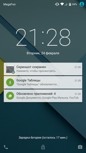 В Lollipop система уведомлений была существенно переработана и расширена. Уведомления вышли за пределы собственной панели на передний план и стали отображаться теперь даже поверх запущенных приложений в виде этаких карточек, каждая из которых интерактивна и кликабельна. Панель быстрого доступа к наиболее важным функциям, совмещенная с панелью уведомлений, теперь стала телескопически раскладываться в два этапа. Также можно отметить появление энергосберегающего режима, которого раньше в «голом» Android просто не существовало, и возможность создания пользовательских профилей — проще говоря, гостевого режима, при котором можно передавать устройство другому человеку без страха за сохранность собственных секретов. Что касается предустановленных программ, то их здесь традиционно нет совсем, имеется лишь набор фирменных приложений самой Google, и больше ничего. Нет даже элементарного файлового менеджера — все необходимо докачивать и доустанавливать из онлайн-магазина Play Store.