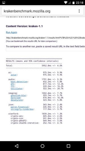 Что касается бенчмарков для оценки скорости движка javascript, то стоит всегда делать скидку на то, что в них результаты существенно зависят от браузера, в котором запускаются, так что сравнение может быть истинно корректным только на одинаковых ОС и браузерах, а такая возможность имеется при тестировании не всегда. В случае с ОС Android мы всегда стараемся использовать Google Chrome.