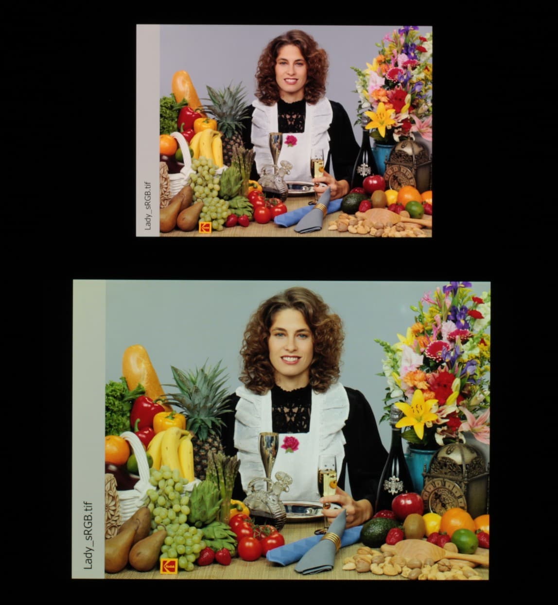 Согласно визуальной оценке, цвета у тестируемого экрана более-менее естественные, а цветовой баланс экранов немного различается. Напомним, что фотография не может служить надежным источником сведений о качестве цветопередачи и приводится только для условной наглядной иллюстрации. В частности, выраженный красноватый оттенок белого и серого полей, присутствующий на фотографиях тестируемого экрана, при перпендикулярном взгляде визуально отсутствует, что подтверждается аппаратными тестами с помощью спектрофотометра. Причина в том, что спектральная чувствительность матрицы фотоаппарата неточно совпадает с этой характеристикой человеческого зрения.