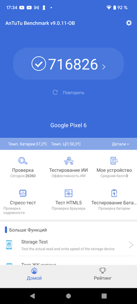 SoC Google Tensor выполнена с соблюдением техпроцесса 5 нм. Смартфон демонстрирует не рекордные, но очень высокие результаты в синтетических тестах. Соответственно, и в реальной эксплуатации недостатка в производительности пользователь не ощутит ни в коей мере. Интерфейс без притормаживаний, приложения открываются без задержек, игры идут на высоких настройках графики.