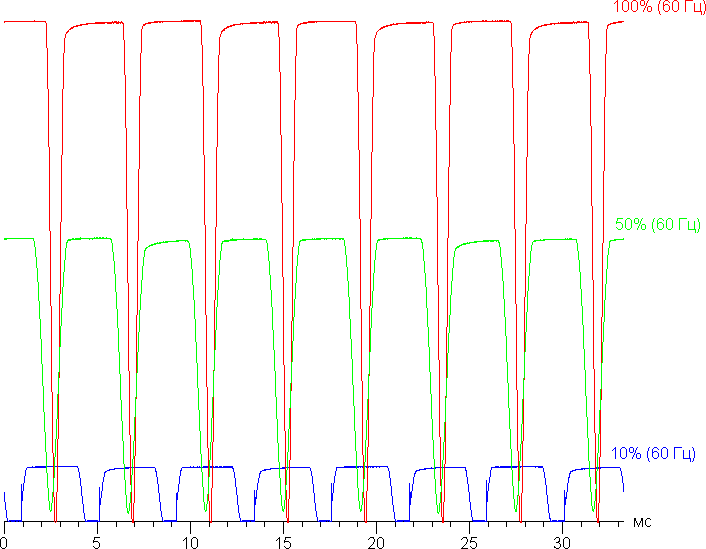 Видно, что на максимальной и средней яркости скважность модуляции низкая, в итоге видимого мерцания нет. Однако при сильном понижении яркости появляется модуляция с высокой скважностью, ее наличие уже можно увидеть в тесте на присутствие стробоскопического эффекта или просто при быстром движении глаз. В зависимости от индивидуальной чувствительности такое мерцание может вызывать повышенную утомляемость. Впрочем, частота довольно высокая и фаза модуляции различается по площади экрана, поэтому негативный эффект от мерцания снижен.