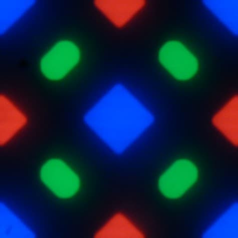 В этом экране используется матрица Super AMOLED — активная матрица на органических светодиодах. Полноцветное изображение создается с помощью субпикселей трех цветов — красного (R), зеленого (G) и синего (B), но красных и синих субпикселей в два раза меньше, что можно обозначить как RGBG. Это подтверждается фрагментом микрофотографии: