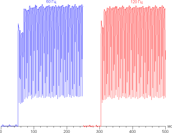 Переключение состояния элементов матрицы выполняется практически мгновенно, но на фронте включения может присутствовать ступенька шириной примерно 17 мс (что соответствует частоте обновления экрана примерно в 60 Гц) или примерно 8 мс (120 Гц). Например, так выглядит зависимость яркости от времени при переходе от черного к белому: