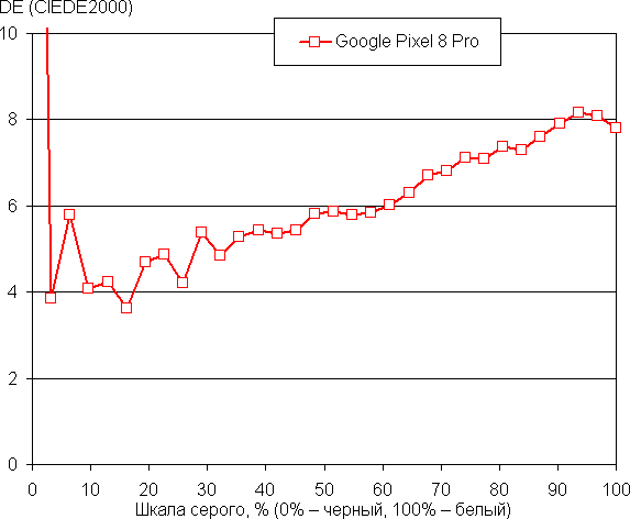 Напомним, что в случае OLED-экранов яркость фрагментов изображения динамично меняется в соответствии с характером выводимого изображения — чуть уменьшается для светлых в целом изображений. В итоге полученная зависимость яркости от оттенка (гамма-кривая), скорее всего, не соответствует гамма-кривой статичного изображения, так как измерения проводились при последовательном выводе оттенков серого почти на весь экран.