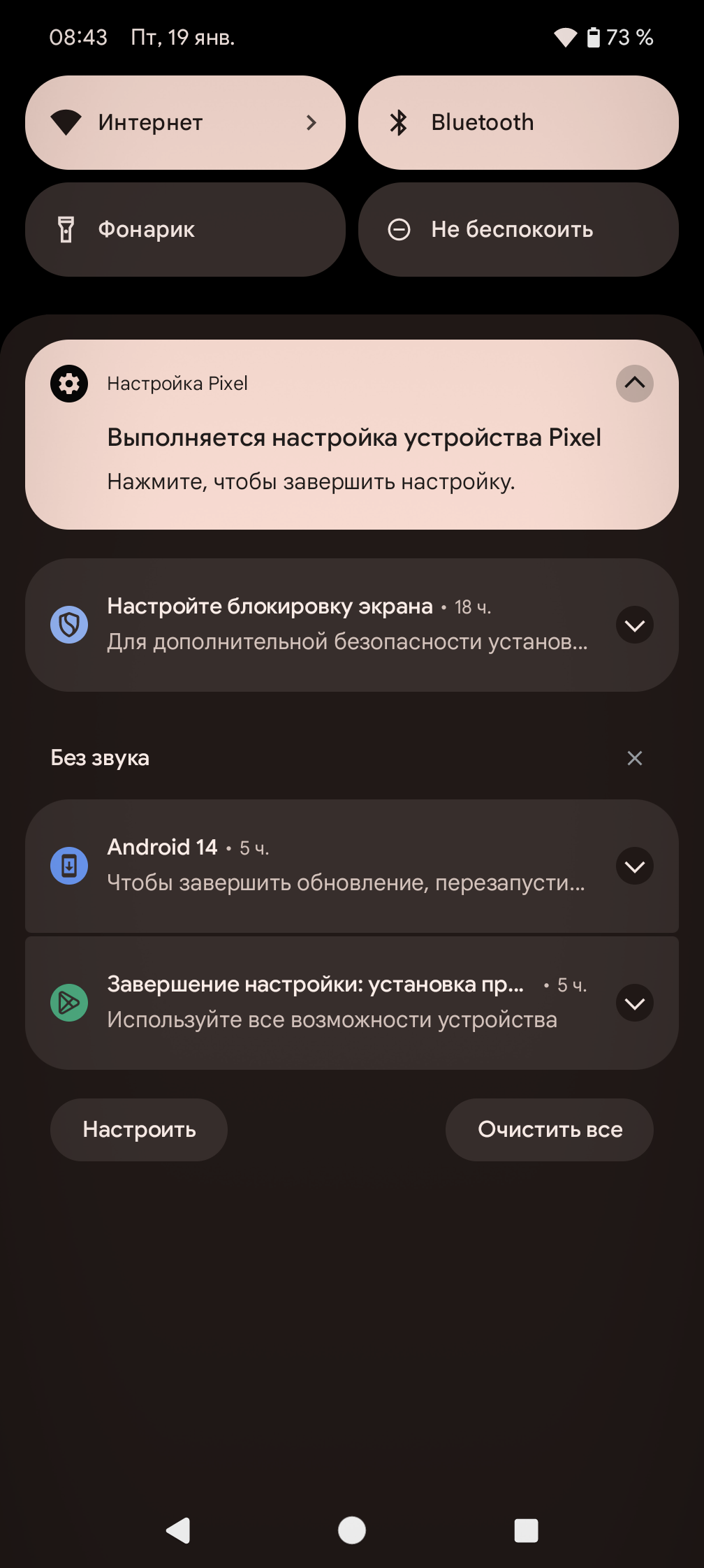 Интерфейс хорошо оптимизированный, работает плавно и быстро. Все необходимые возможности для самостоятельной настройки имеются, можно использовать жесты или вывести для управления три классические кнопки внизу. В «чистой» версии Android шторка не разделена на две части в зависимости от места оттягивания, она единая телескопическая. В новой версии добавили еще больше возможностей для кастомизации внешнего вида: виджеты и обои можно буквально программировать вручную, они будут реагировать на время суток и погоду, меняясь и подстраиваясь. Очень много внимания уделено работе функций на основе ИИ, но в текущих реалиях на территории России от них толку мало.