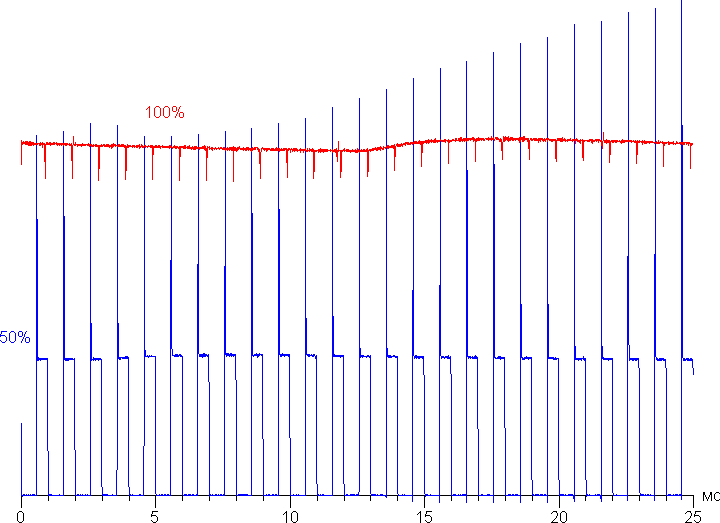 На уровне яркости ниже максимального есть модуляция подсветки, с частотой 1 кГц, то есть яркость регулируется с помощью ШИМ.