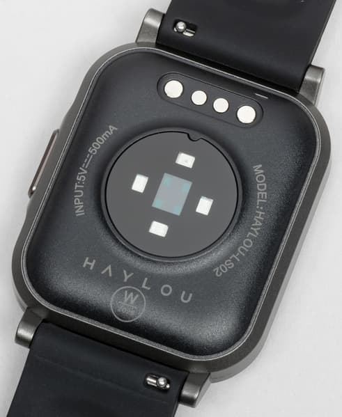 На тыльной стороне часов ничего необычного нет. В центре — блок с датчиками, у верхней петли — контакты для подсоединения зарядного кабеля. Разве что обратим внимание на надпись «Input: 5V 500mA». Это значит, что даже от мощного зарядного блока часы будут заряжаться весьма медленно.
