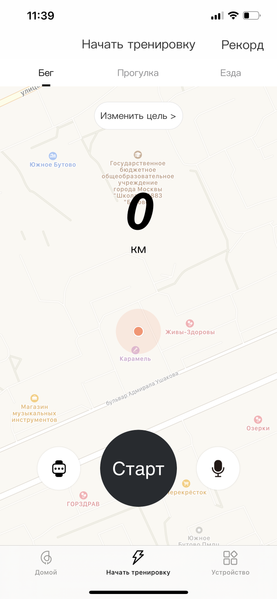 Если с главного экрана нажать стрелочку «Назад» в левом верхнем углу, то мы увидим строку с названием устройства и уровнем его заряда (о том, насколько «точные» это данные — расскажем далее), а внизу — три кнопки: «Домой», «Начать тренировку» и «Устройство» (на нем мы и находимся). Интереснее — раздел «Домой», в котором, как оказывается, аккумулируются все фитнес-данные.