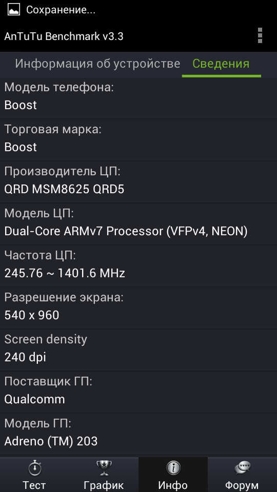 | HighScreen Boost (Qualcomm MSM8625, 2×1,4 ГГц, Adreno 203) | ZTE V970 (Nvidia Tegra 2, 2×1 ГГц) | Motorola Razr HD (Qualcomm MSM8960, 2×1,5 ГГц, Adreno 225) | Fly IQ440 (MediaTek MTK6577, 2×1 ГГц, PowerVR SGX 531) | LG Optimus L9 (TI OMAP 4430, 2×1 ГГц, PowerVR SGX 540) | |