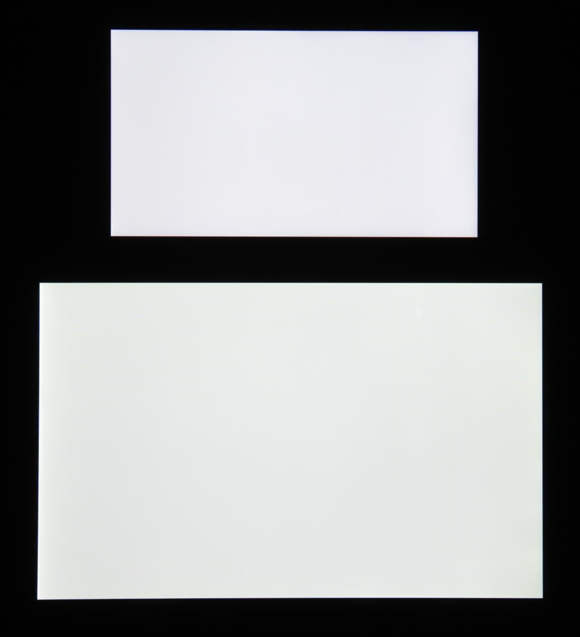Яркость под углом у экранов уменьшилась (как минимум в 5 раз, исходя из разницы в выдержке), но у Highscreen Power Rage Evo изображение все же чуть ярче. Черное поле при отклонении по диагонали высветляется сильно и приобретает фиолетовый или красно-фиолетовый оттенок. Фотографии ниже это демонстрируют (яркость белых участков в перпендикулярном плоскости экранов направлении одинаковая!):