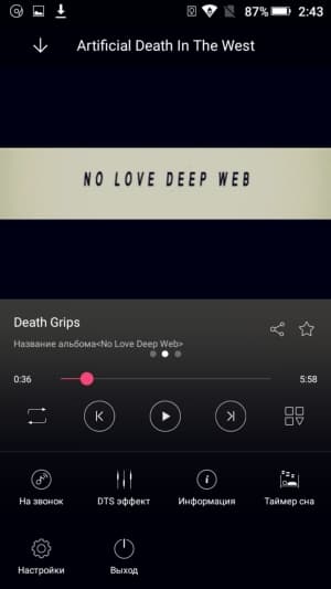 Для прослушивания музыки здесь предназначен музыкальный проигрыватель с симпатичным интерфейсом и богатым набором дополнительных настроек на основе системы виртуального звука DTS с возможностью выбора пресетов эквалайзера под определенные типы наушников. Звучит в наушниках смартфон на удивление качественно: звук глубокий, басовитый, чистый и довольно мощный, прослушивание музыкальных композиций здесь вполне комфортно.