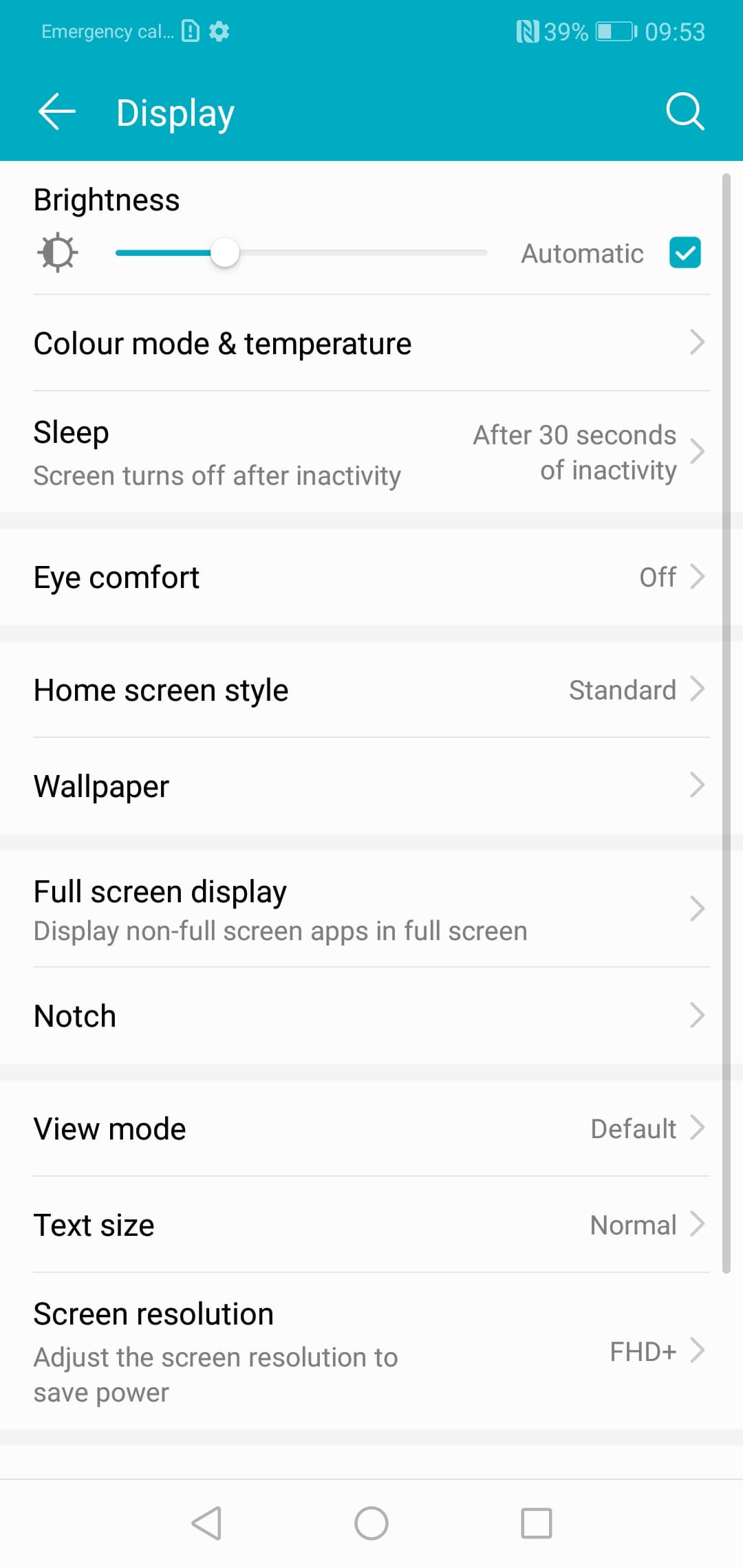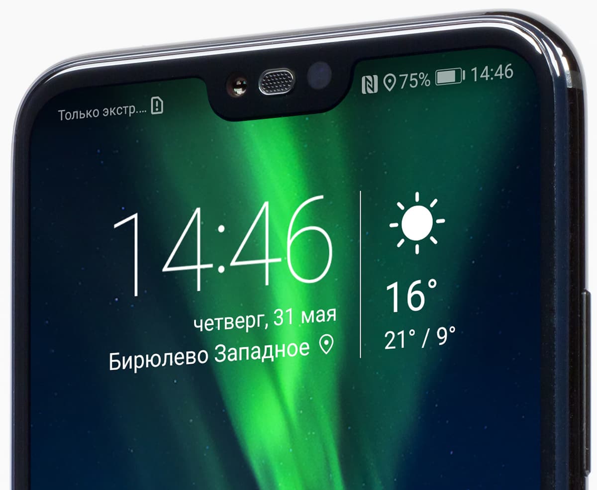 Honor 10 оснащен дисплеем IPS с защитным 2.5D-стеклом. Размеры экрана составляют примерно 64×134 мм, при этом диагональ 5,84″, а разрешение — 2280×1080 (соотношение сторон 19:9, плотность точек около 432 ppi). Ширина рамки вокруг экрана по бокам составляет около 3 мм, отступ снизу имеет высоту около 1 см, а сверху — всего 5 мм (не считая «челки»).