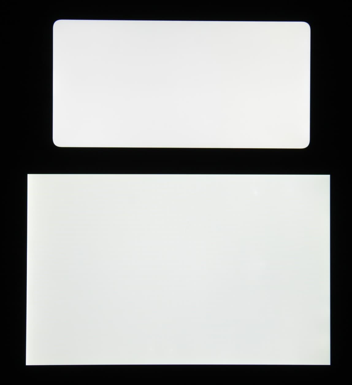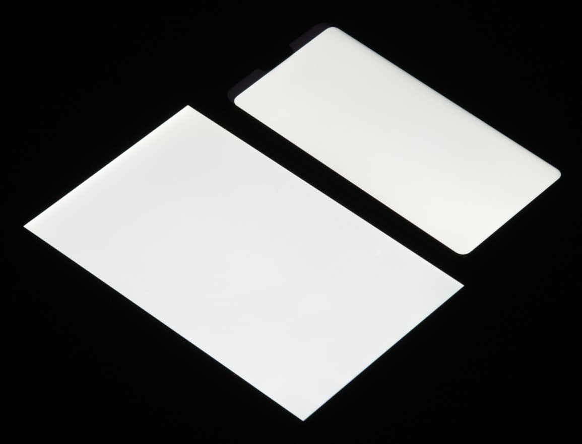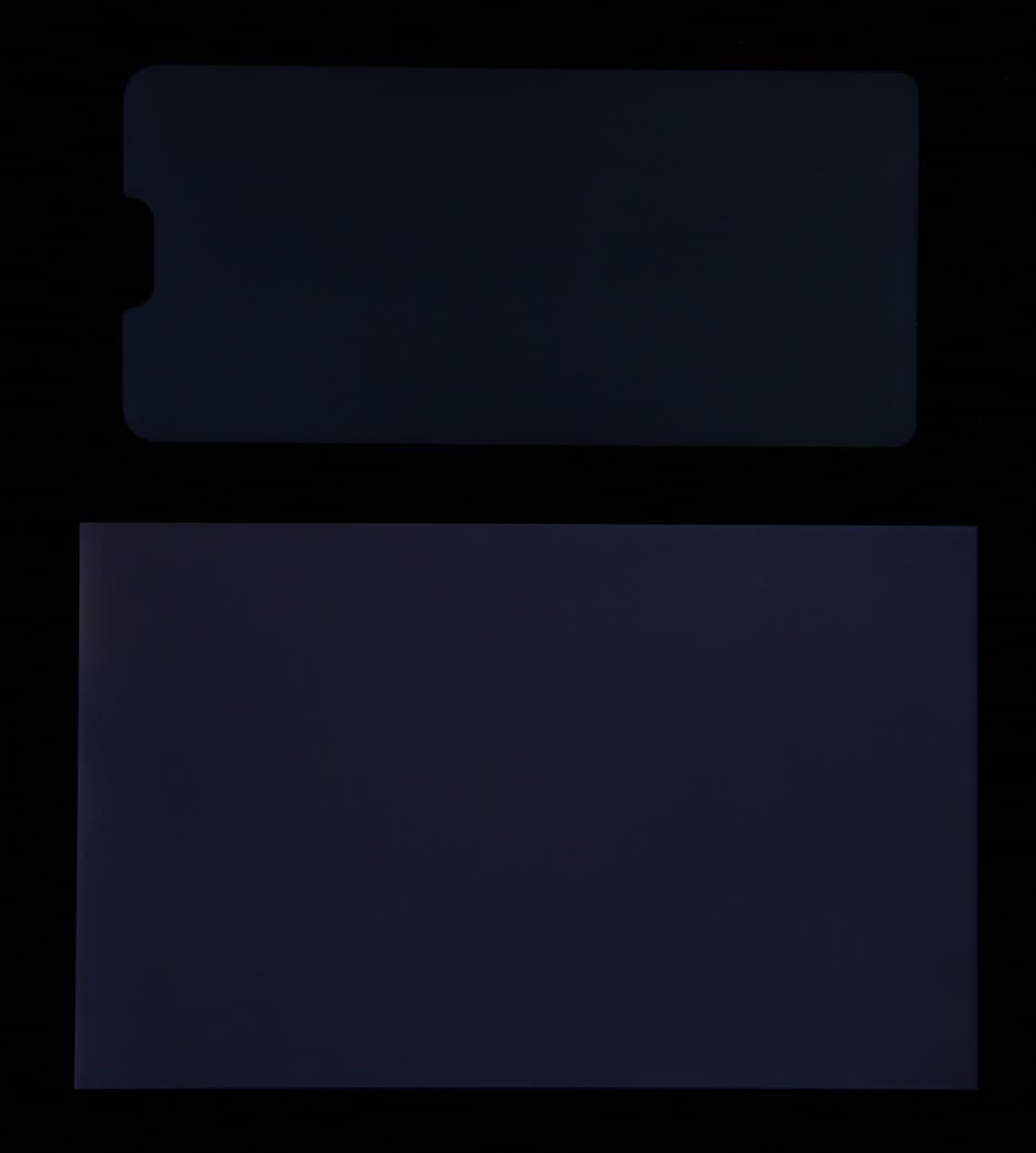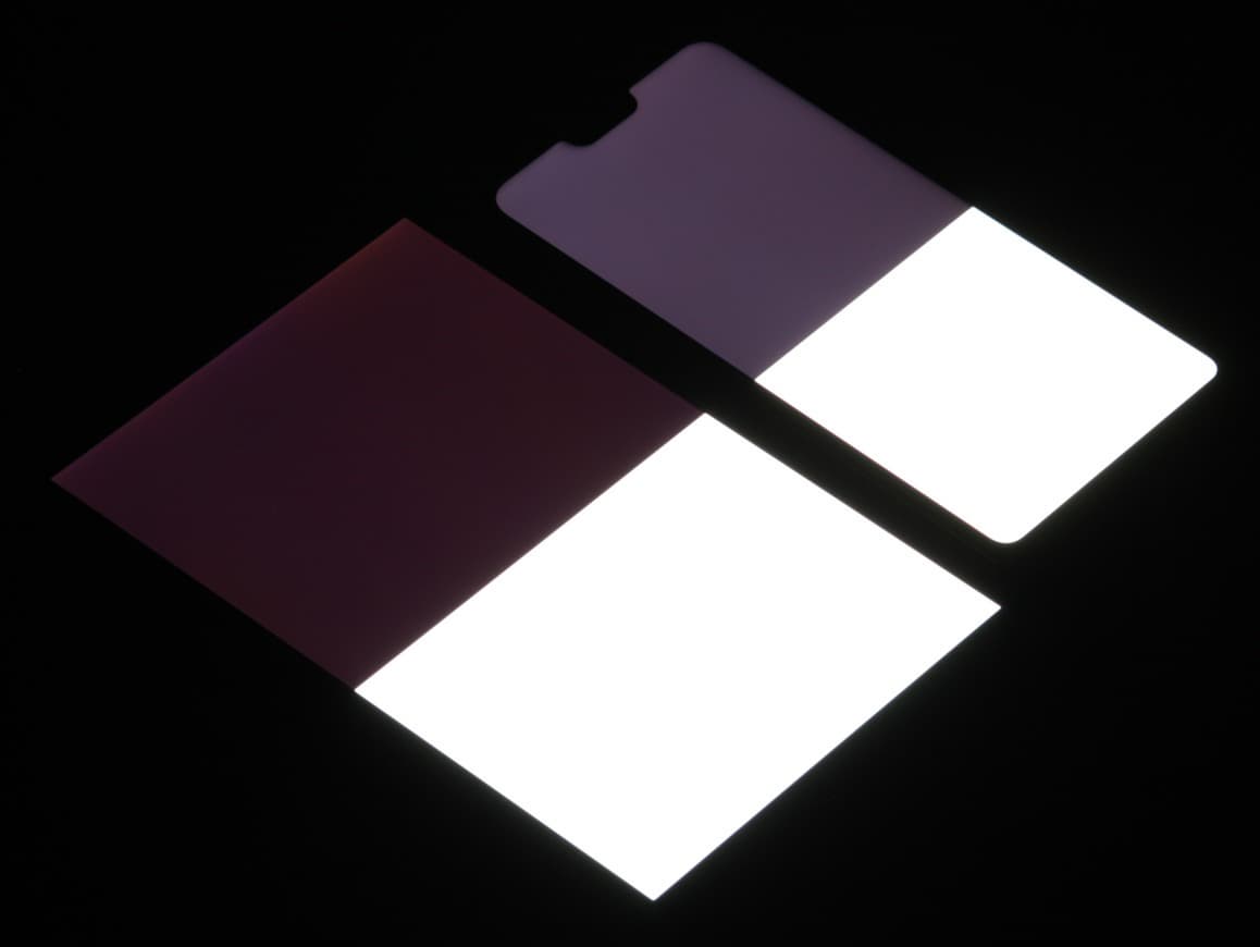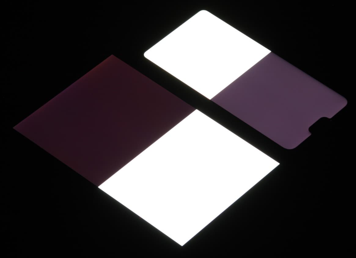 Яркость под углом у экранов уменьшилась (как минимум в 5 раз, исходя из разницы в выдержке), но у Honor 10 экран все же немного темнее. Черное поле при отклонении по диагонали высветляется сильно и приобретает красно-фиолетовый оттенок. Фотографии ниже это демонстрируют (яркость белых участков в перпендикулярном плоскости экранов направлении одинаковая!):