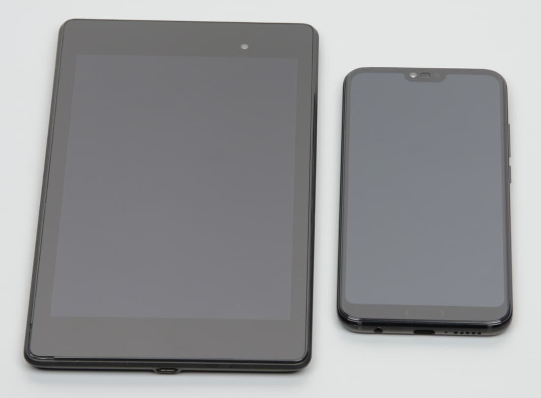 Лицевая поверхность экрана выполнена в виде стеклянной пластины с зеркально-гладкой поверхностью, устойчивой к появлению царапин. Судя по отражению объектов, антибликовые свойства экрана примерно такие же, как у экрана Google Nexus 7 (2013) (далее просто Nexus 7). Для наглядности приведем фотографию, на которой в выключенных экранах отражается белая поверхность (слева — Nexus 7, справа — Honor 10, далее их можно различать по размеру):