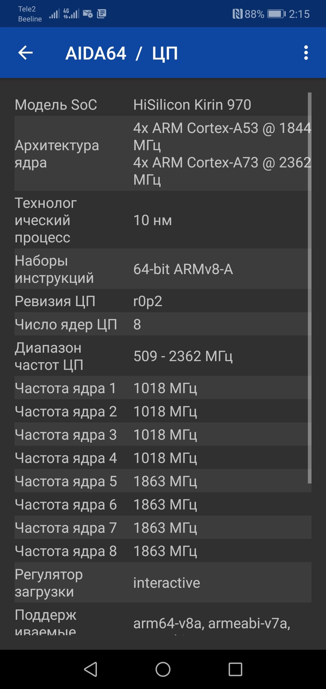 - SoC HiSilicon Kirin 970, 8 ядер: 4×Cortex-A73 @2,36 ГГц + 4×Cortex-A53 @1,8 ГГц