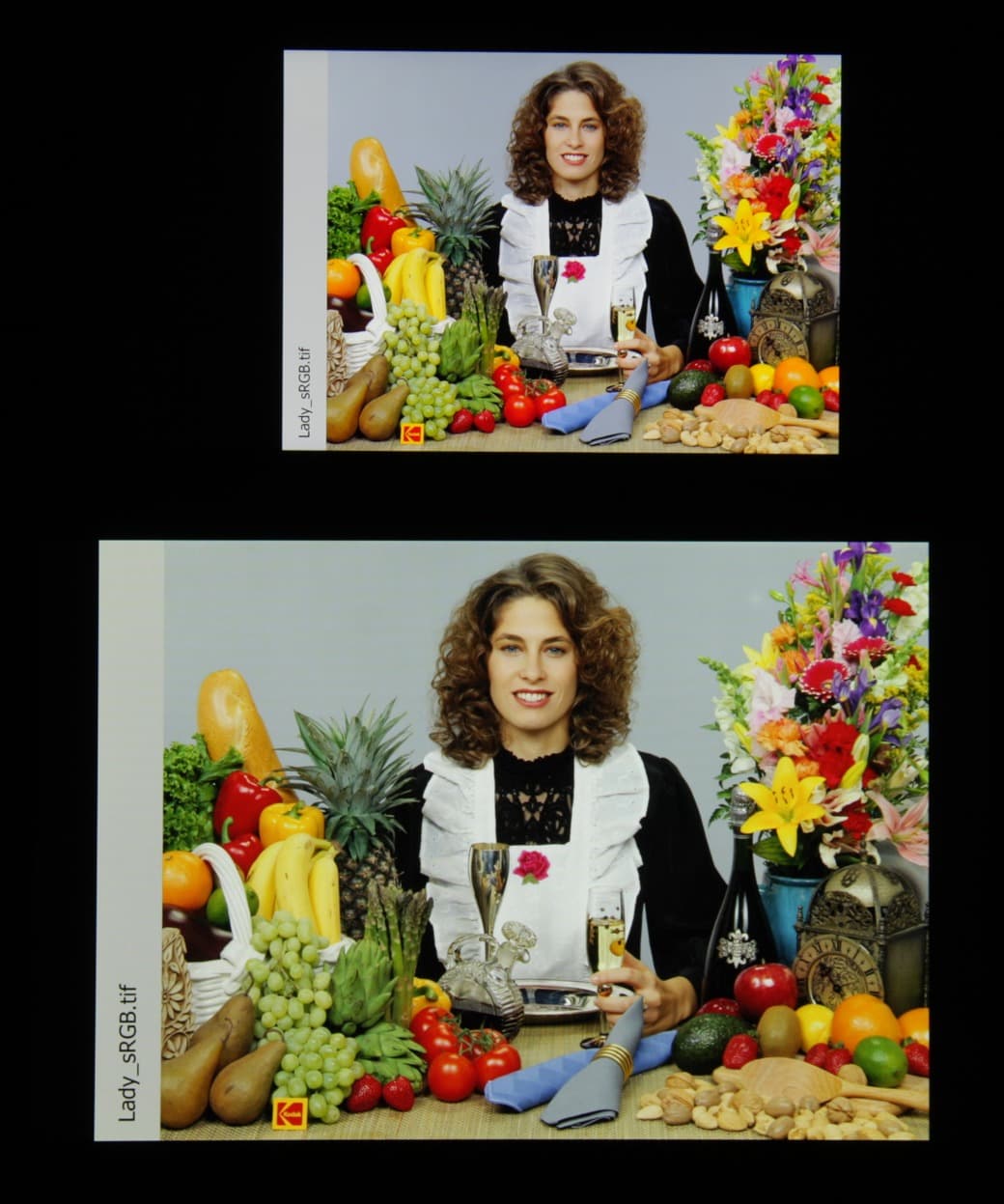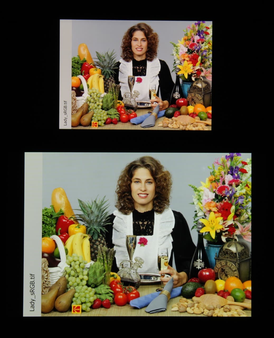 Спектры компонент хорошо разделены, что и обуславливает широкий цветовой охват. Такое мы уже видели в случае, например, Sony Xperia Z2 и других мобильных устройств. Sony указывает, что в этих экранах используются светодиоды с синим излучателем и зеленым и красным люминофором (обычно — синий излучатель и желтый люминофор), что в сочетании со специальными светофильтрами матрицы и позволяет получить широкий цветовой охват. Да, и в красном люминофоре, видимо, используются так называемые квантовые точки. Для потребительского устройства широкий цветовой охват является никак не достоинством, а существенным недостатком, поскольку в итоге цвета изображений — рисунков, фотографий и фильмов, — ориентированных на пространство sRGB (а таких подавляющее большинство), имеют неестественную насыщенность. Особенно это заметно на узнаваемых оттенках, например на оттенках кожи. Результат приведен на фотографиях выше.