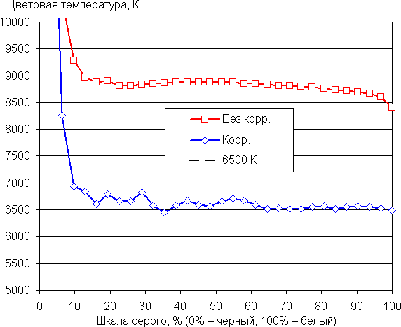 Баланс оттенков на шкале компромиссный, так как цветовая температура существенно выше стандартных 6500 К, но отклонение от спектра абсолютно черного тела (ΔE) ниже 10, что для потребительского устройства считается приемлемым показателем. При этом цветовая температура и ΔE мало изменяются от оттенка к оттенку — это положительно сказывается на визуальной оценке цветового баланса. (Самые темные области шкалы серого можно не учитывать, так как там баланс цветов не имеет большого значения, да и погрешность измерений цветовых характеристик на низкой яркости большая.)