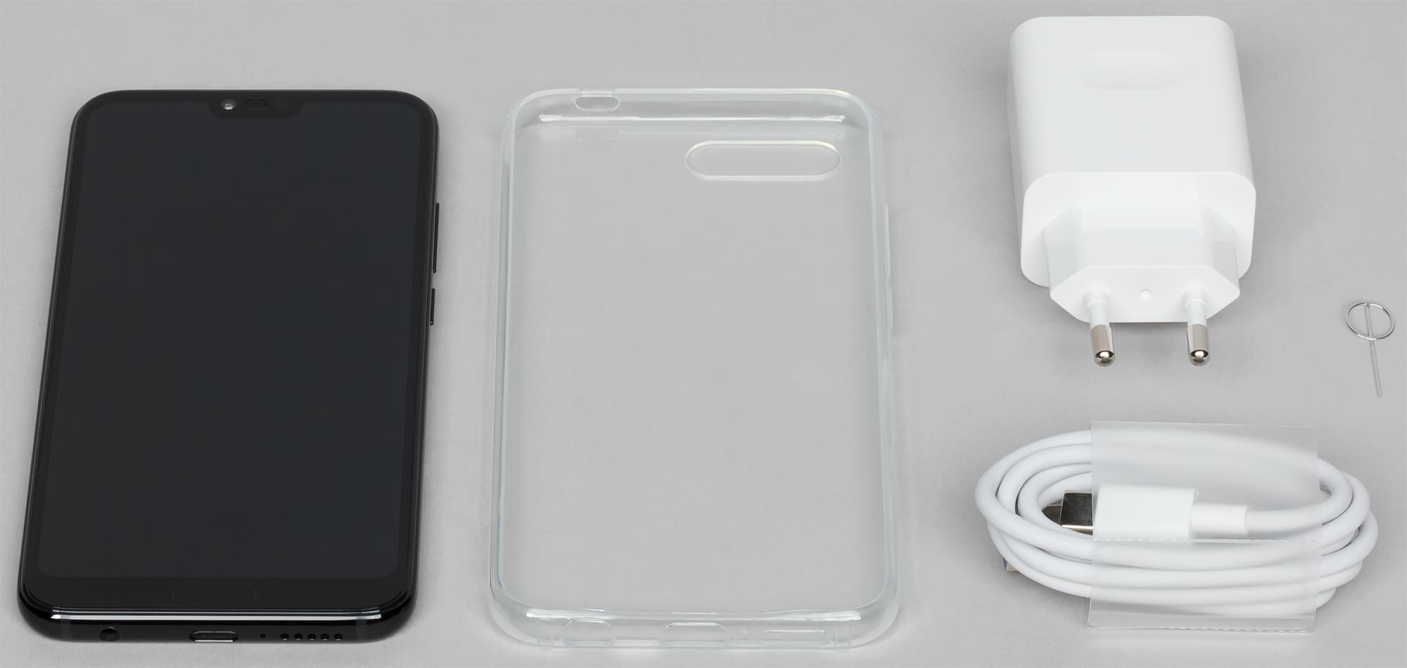 Комплектация Honor 10 включает соединительный USB-кабель, сетевой адаптер Super Charge, прозрачный полиуретановый защитный чехол, а также ключик для извлечения карт.