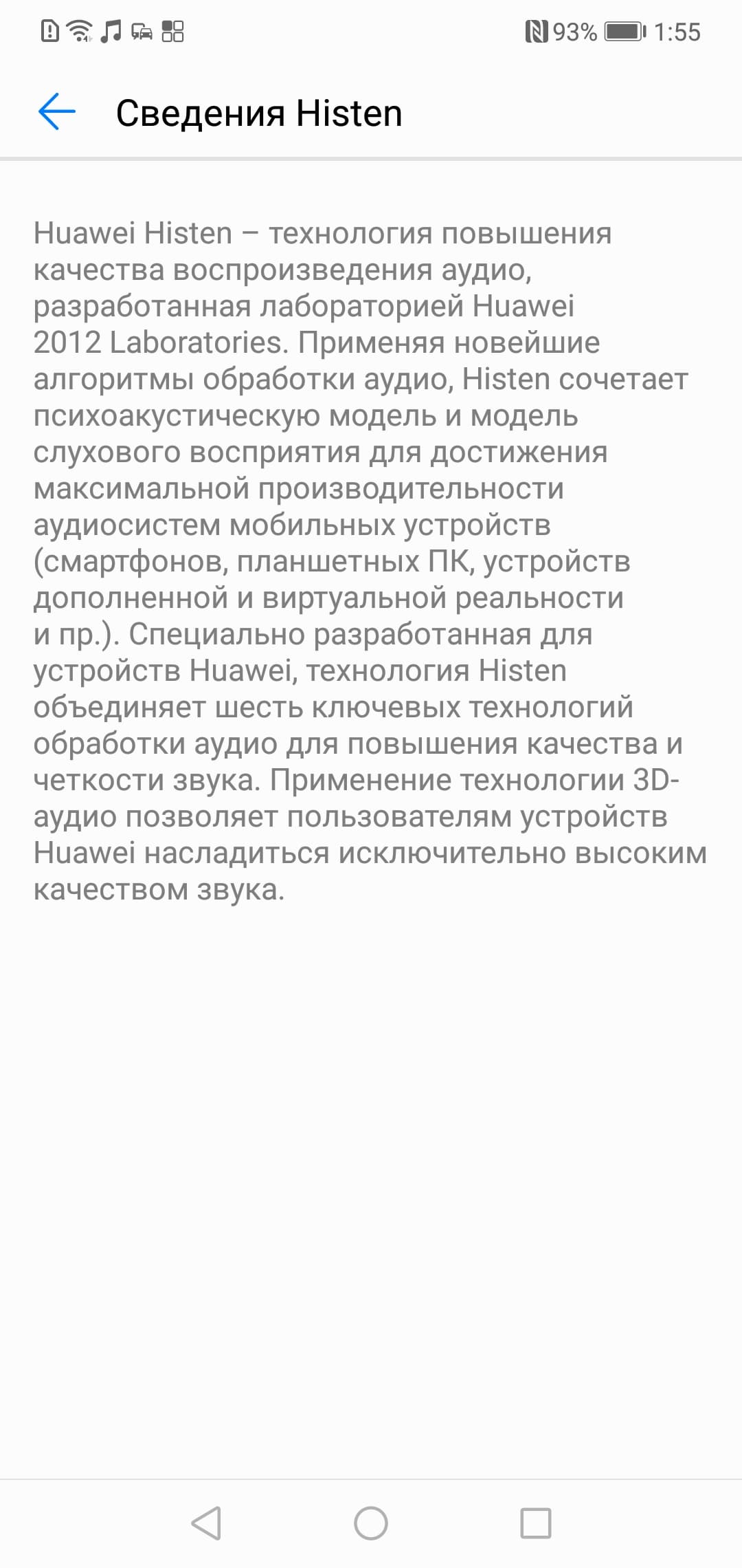 В плане звучания Honor 10 хорош, иные дорогущие флагманы (например, Sony) не выдают столь же густого и насыщенного звука, как герой обзора, практически не уступающий по этому параметру своим более топовым сородичам. И в наушниках, и даже через громкоговоритель звук чистейший, насыщенный широким спектром частот, чрезвычайно приятный слуху, запас громкости достаточен. Технологии аудиоэффектов Huawei Histen позволяют включать эффект 3D-звука и выбирать из пресетов эквалайзера — правда, все это становится доступно только с подключенными наушниками.
