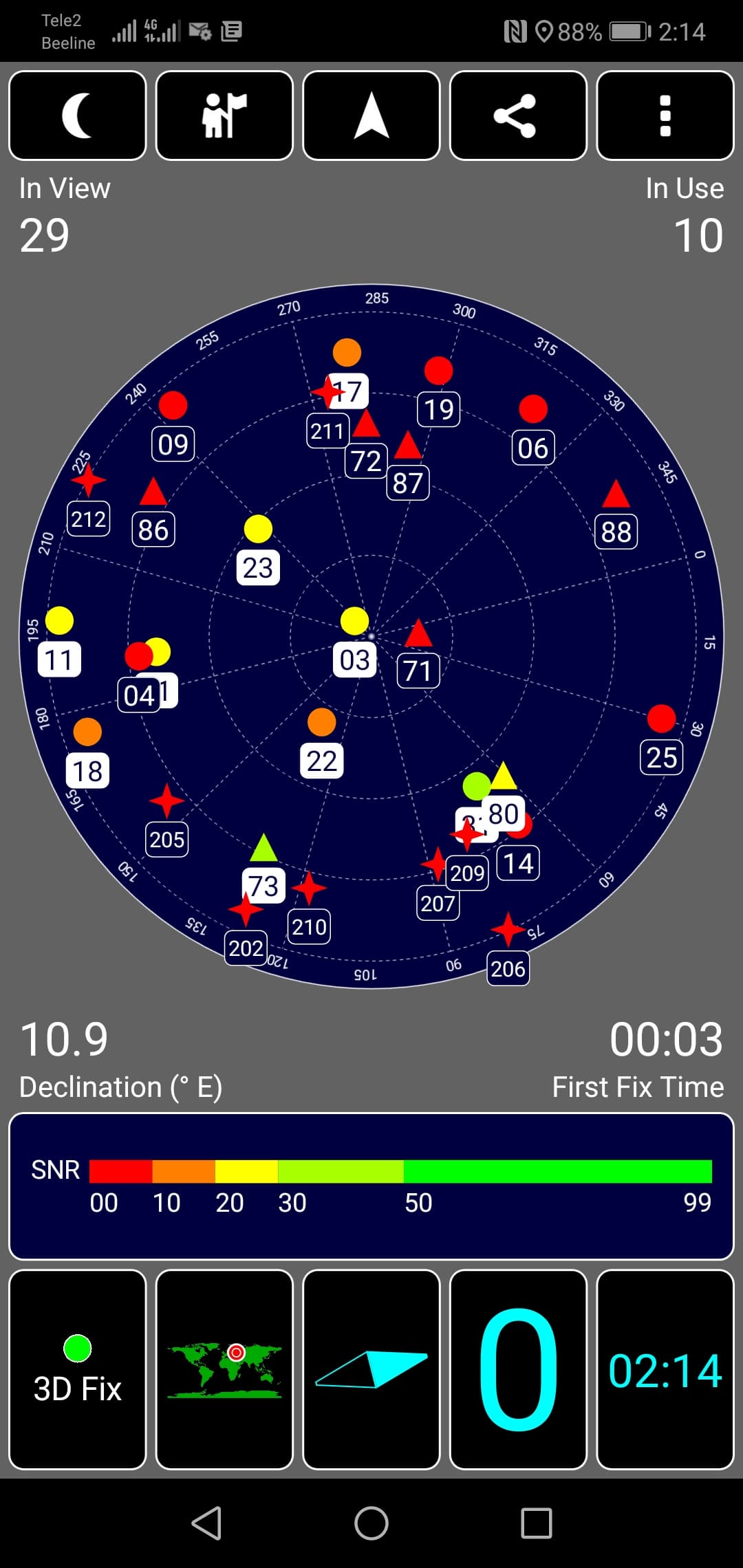 Навигационный модуль работает и с GPS (с A-GPS), и с отечественной Глонасс, и с китайской Beidou. Первые спутники даже при холодном старте обнаруживаются быстро, в течение первых же секунд, точность позиционирования не вызывает претензий. Магнитный компас, необходимый для навигационных программ, на месте.