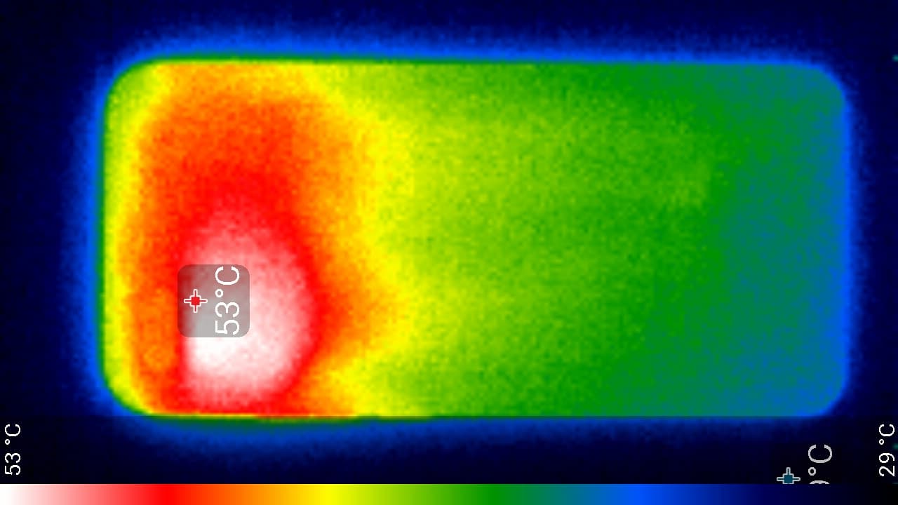 Нагрев больше локализован в верхней правой части аппарата, что, видимо, соответствует расположению микросхемы SoC. По данным теплокамеры, максимальный нагрев составил 53 градуса (при температуре окружающего воздуха в 24 градуса), и это, пожалуй, самый сильный нагрев в данном тесте при сравнении с другими современными смартфонами.