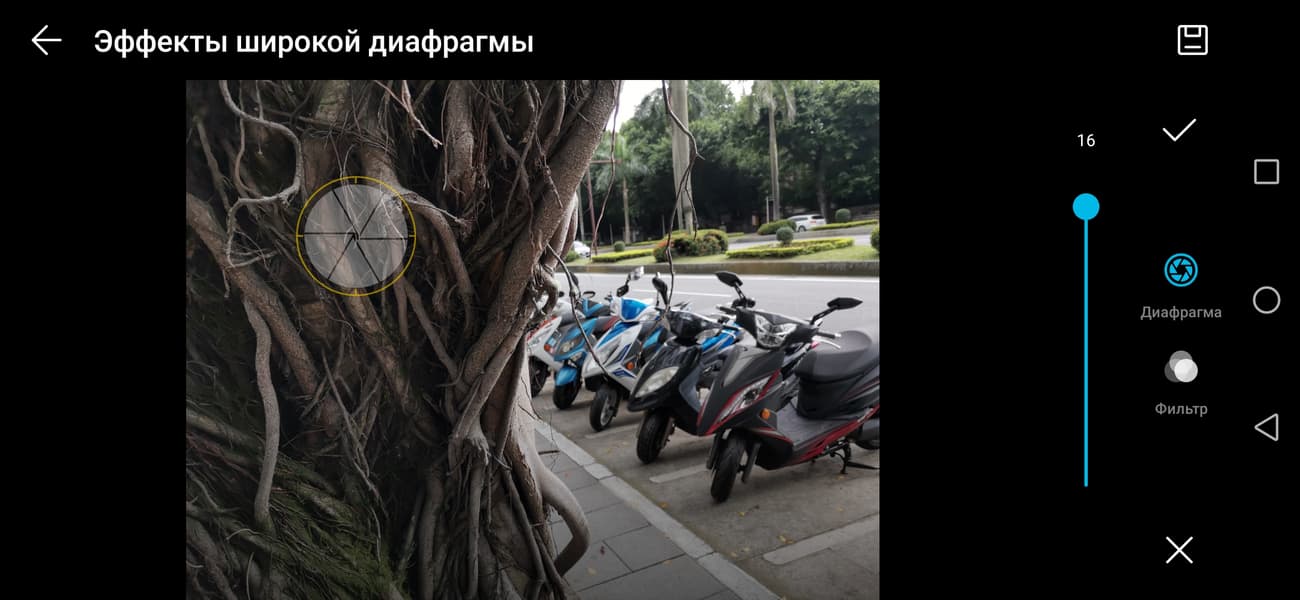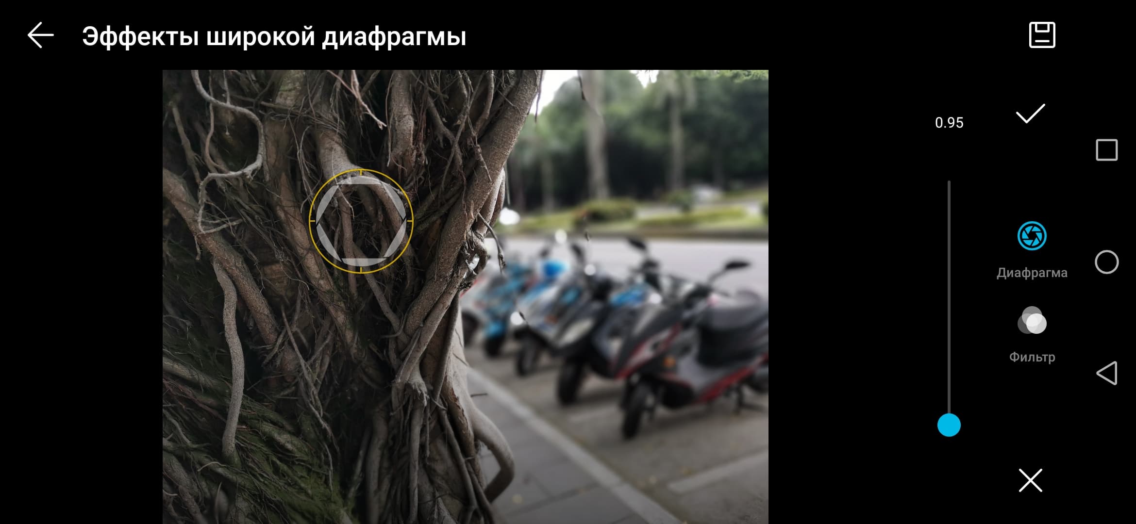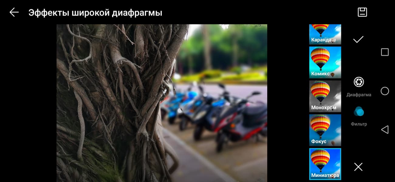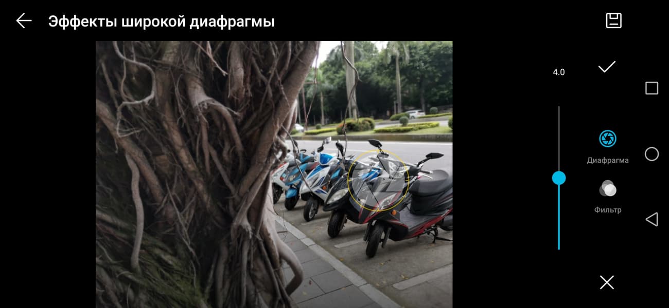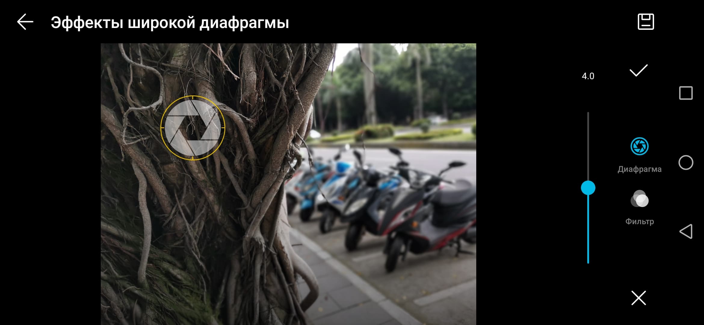 «Диафрагма» – это интересный режим, который задействует дополнительный объектив Honor 20, отвечающий за измерение глубины сцены. Смысл здесь тот же, что и при съемке портретов, т.е. в отделении переднего плана от заднего и последующем размытии последнего. Но есть несколько отличий. Первое – фотографировать в этом режиме можно уже не только людей. Второе – настроить степень размытия фона в пределах от 0 до 10 вы можете в любой момент после съемки самого кадра. Плюс наложить на размытую часть один из нескольких эффектов, особенно хорошо получается с эффектом «Миниатюра».