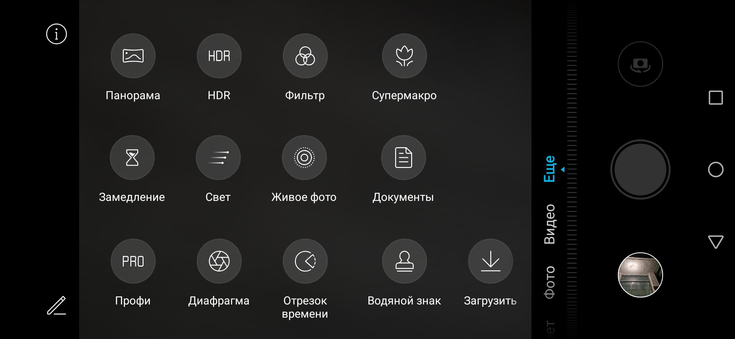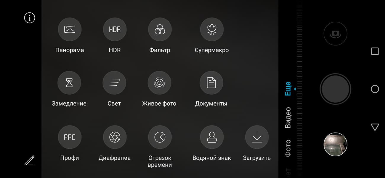 Перечисленное выше – это, разумеется, далеко не все фотовозможности Honor 20. Если в основном списке режимов выбрать пункт «Еще», то появится дополнительное меню с массой интересного. Пройдемся по порядку по всему списку.