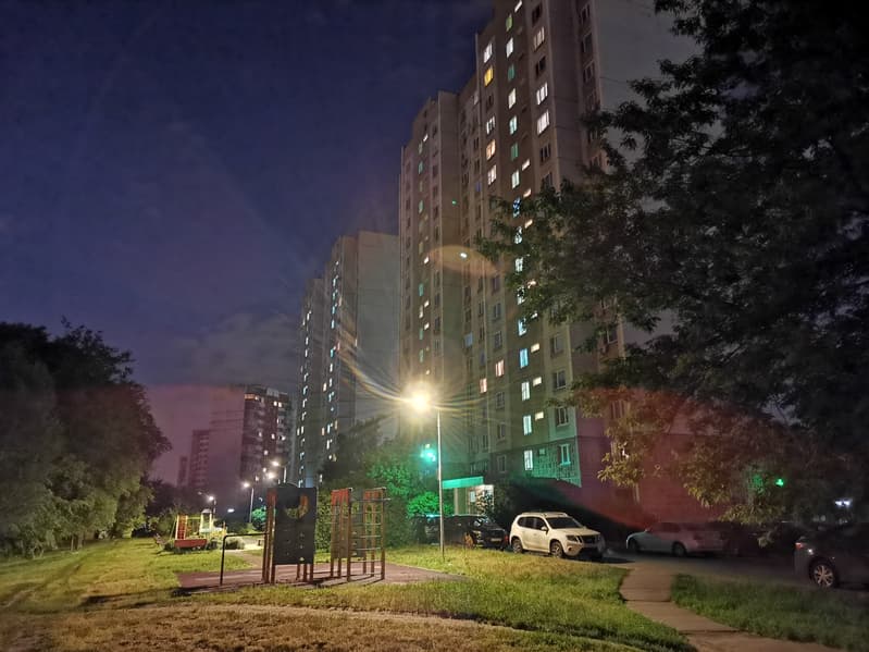 Последний фоторежим из списка основных называется «Ночь». Это тоже некий автопилот, но уже для съемки сцен с недостаточным освещением. По сути, его работа сводится к мультиэкспозиции. Вы компонуете кадр, выбираете ISO и выдержку, а затем ровно-ровно и прочно-прочно держите смартфон в течение нескольких секунд, пока камера делает множество кадров и автоматика компонует их вместе. Учитывая алгоритм, вполне логично, что динамичные сцены, когда в кадре что-то движется, снимать в этом режиме решительно бесполезно. Зато статичные сюжеты выглядят довольно интересно.
