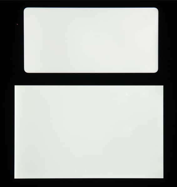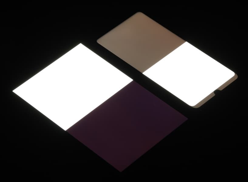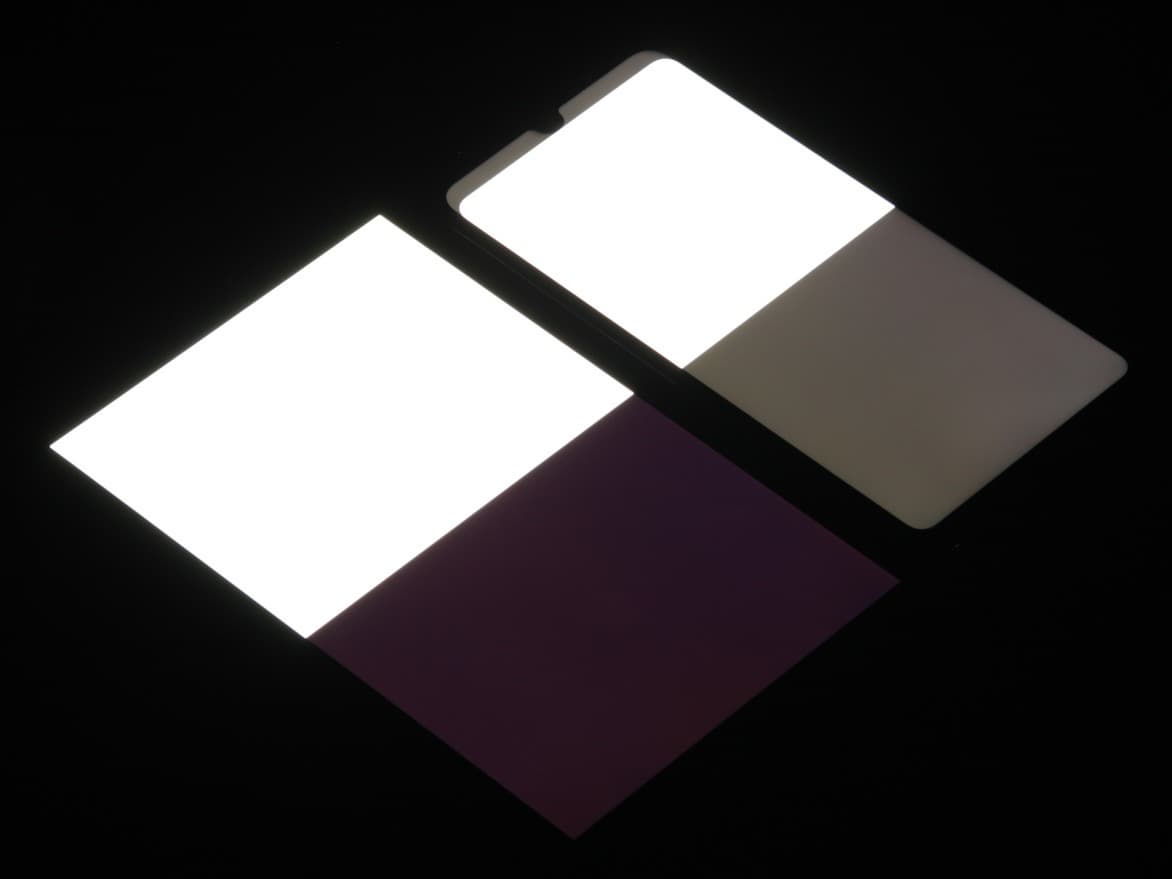 Яркость под углом у экранов уменьшилась (как минимум в 5 раз, исходя из разницы в выдержке), но у Honor 20 Lite экран все же немного темнее. Черное поле при отклонении по диагонали высветляется сильно, и приобретает чуть розоватый оттенок. Фотографии ниже это демонстрируют (яркость белых участков в перпендикулярном плоскости экранов направлении одинаковая!):