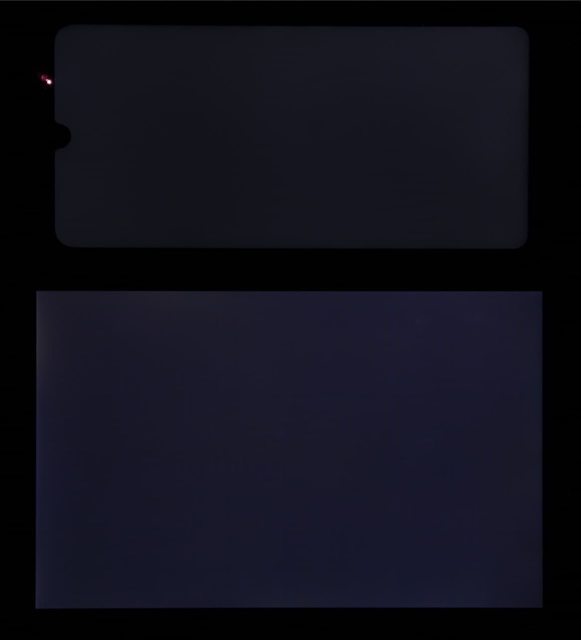 Лицевая поверхность экрана выполнена в виде стеклянной пластины с зеркально-гладкой поверхностью, устойчивой к появлению царапин. Судя по отражению объектов, антибликовые свойства экрана лучше, чем у экрана Google Nexus 7 (2013) (далее просто Nexus 7). Для наглядности приведем фотографию, на которой в выключенных экранах отражается белая поверхность (слева — Nexus 7, справа — Honor 20 Lite, далее их можно различать по размеру):