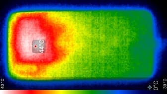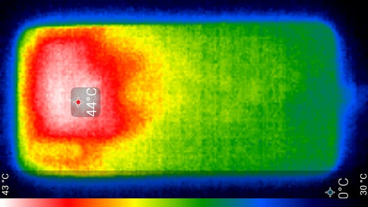 Нагрев больше в верхней части аппарата, что, видимо, соответствует расположению микросхемы SoC. По данным теплокамеры, максимальный нагрев составил 44 градуса (при температуре окружающего воздуха в 24 градуса), это выше среднего значения в данном тесте для современных смартфонов.