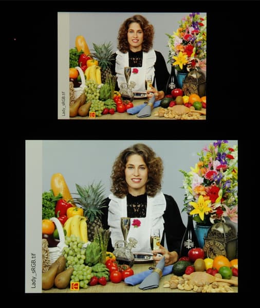Спектры компонент достаточно хорошо разделены, что и обуславливает широкий цветовой охват. Для потребительского устройства широкий цветовой охват является недостатком, поскольку в итоге цвета изображений — рисунков, фотографий и фильмов, — ориентированных на пространство sRGB (а таких подавляющее большинство), имеют неестественную насыщенность. Особенно это заметно на узнаваемых оттенках, например на оттенках кожи. Результат приведен на фотографиях выше.