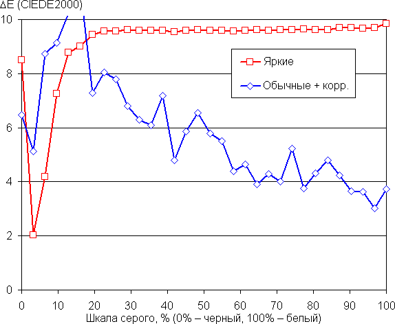 Баланс оттенков на шкале серого после выбора профиля Обычные не идеальный, так как на большей части шкалы серого цветовая температура близка к стандартным 6500 К, но отклонение от спектра абсолютно черного тела (ΔE) порядка 10, что даже для потребительского устройства считается не очень хорошим показателем. Мы попробовали выполнить дополнительную коррекцию, передвинув точку на круге в положение, как на снимке выше. На графиках ниже кривые Яркие соответствуют результатам, полученным после выбора профиля Яркие, а кривые Обычные + корр. — данным, полученным после выбора профиля Обычные и выполненной коррекции. (Самые темные области шкалы серого можно не учитывать, так как там баланс цветов не имеет большого значения, да и погрешность измерений цветовых характеристик на низкой яркости большая.)