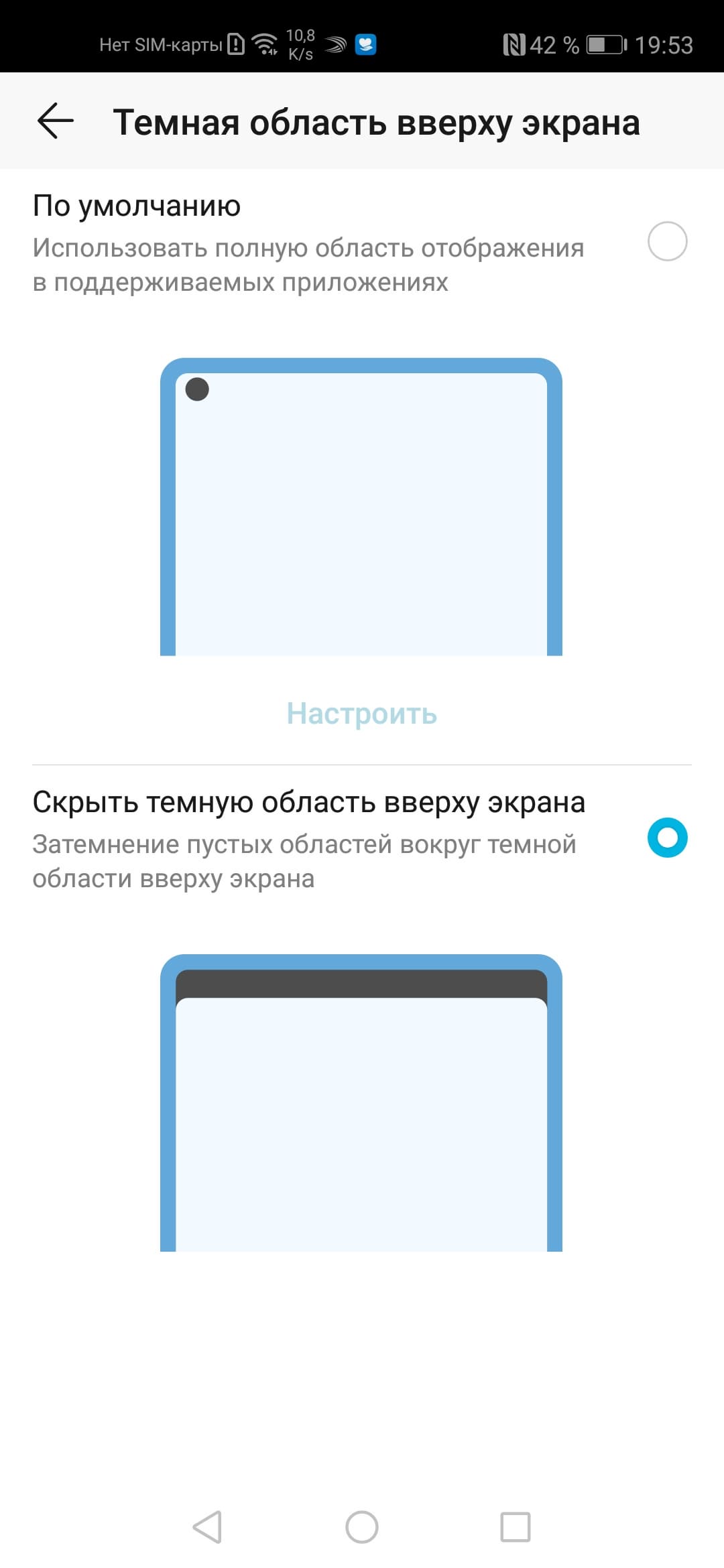 Имеется функция разблокировки по лицу, но она реализована лишь на основе единственной фронтальной камеры без возможности построения трехмерной сетки изображения, поскольку второго датчика здесь нет. Соответственно, это не максимально надежный уровень защиты. В темноте разблокировка по лицу не срабатывает. Также есть возможность управления жестами, с помощью одной руки, имеется режим GPU Turbo 3.0, поднимающий производительность в играх, и многое другое. Если вас раздражает круглый глазок камеры, его можно замаскировать, выведя темную полоску по верху экрана.