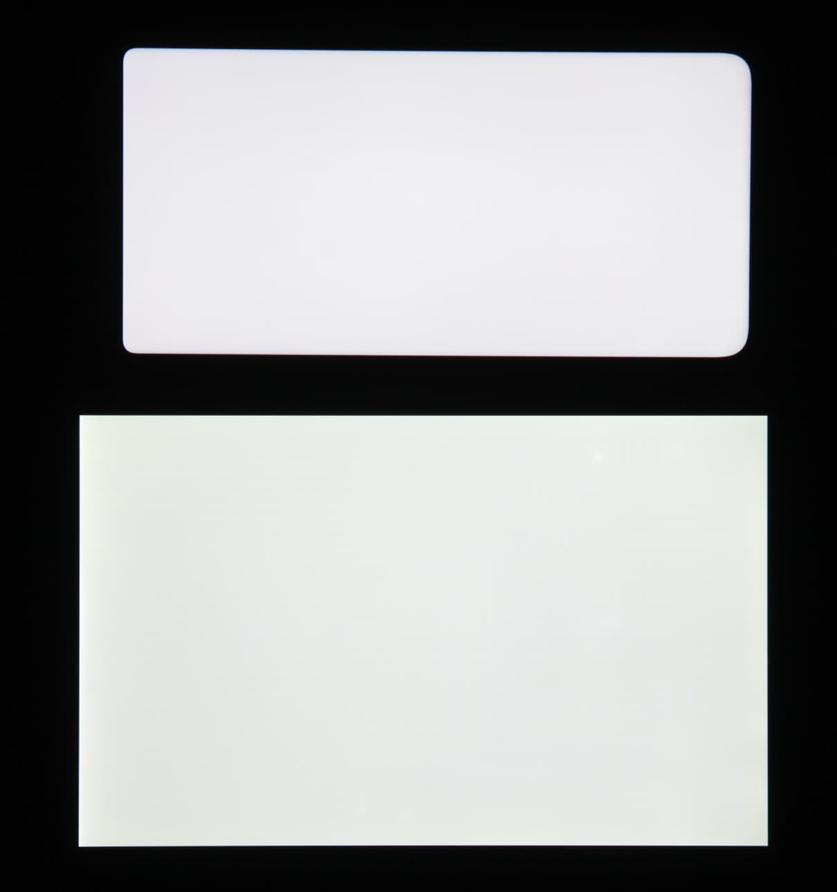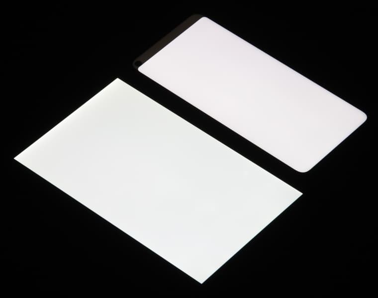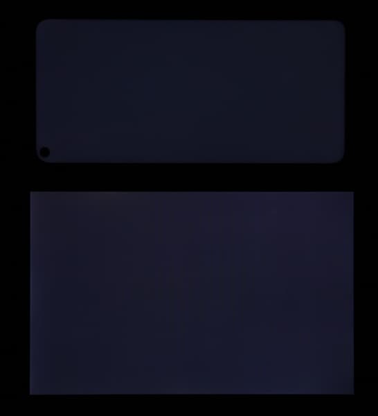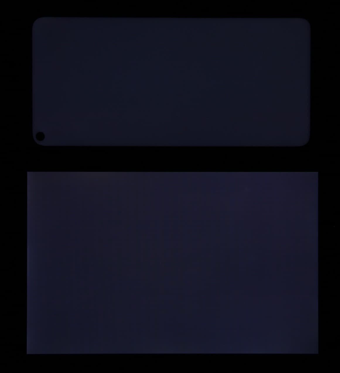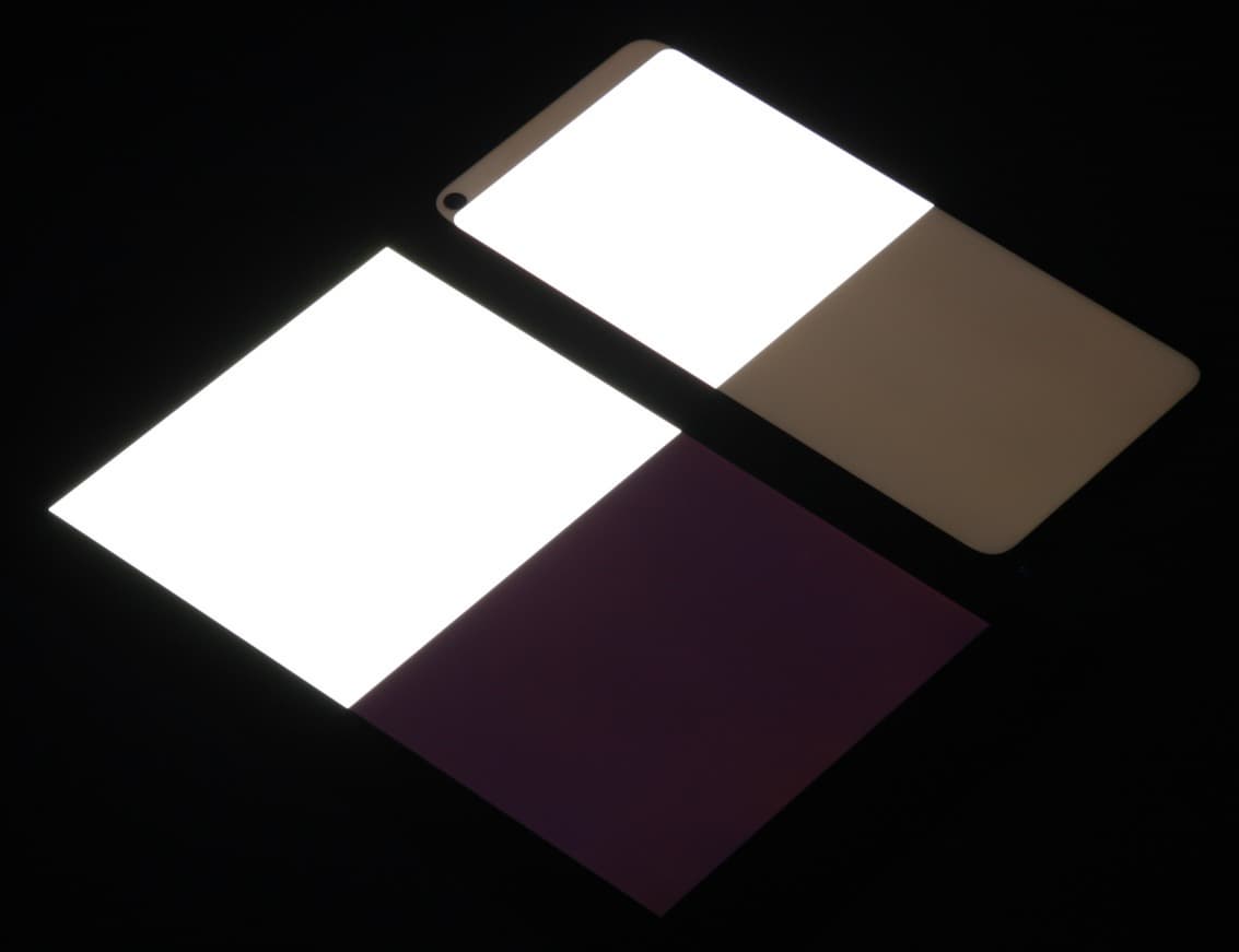 Яркость под углом у экранов уменьшилась (как минимум в 5 раз, исходя из разницы в выдержке), но у Honor 20 Pro экран все же чуть-чуть темнее. Черное поле при отклонении по диагонали высветляется сильно, но остается условно нейтрально-серым. Фотографии ниже это демонстрируют (яркость белых участков в перпендикулярном плоскости экранов направлении одинаковая!):