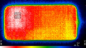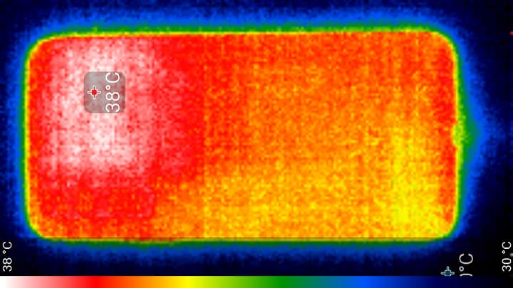 Нагрев больше в верхней части аппарата, что, видимо, соответствует расположению микросхемы SoC, но в целом нагрев задней панели равномерный. По данным теплокамеры, максимальный нагрев составил 38 градусов (при температуре окружающего воздуха в 24 градуса), это не очень много.