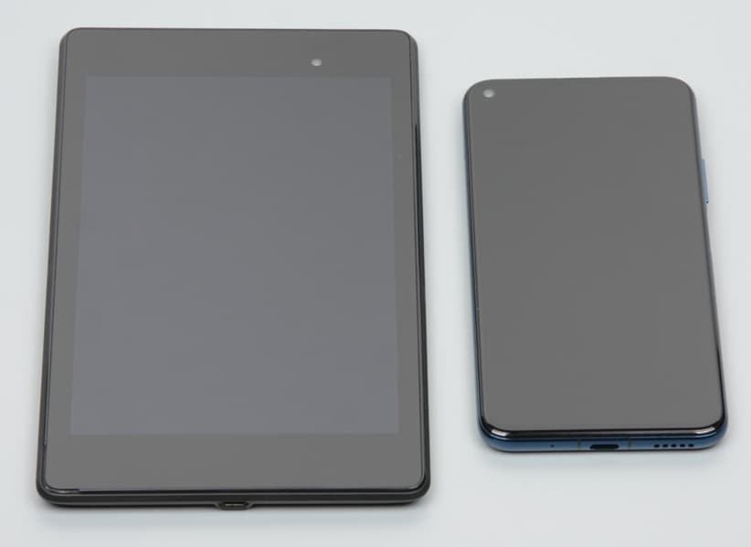 Лицевая поверхность экрана выполнена в виде стеклянной пластины с зеркально-гладкой поверхностью, устойчивой к появлению царапин. Судя по отражению объектов, антибликовые свойства экрана лучше, чем у Google Nexus 7 (2013) (далее просто Nexus 7). Для наглядности приведем фотографию, на которой в выключенных экранах отражается белая поверхность (слева — Nexus 7, справа — Honor 20 Pro, далее их можно различать по размеру):