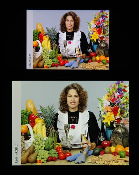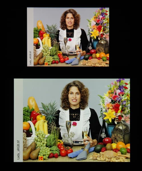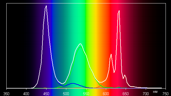 Спектры компонент достаточно хорошо разделены, что и обуславливает широкий цветовой охват. Для потребительского устройства широкий цветовой охват является недостатком, поскольку в итоге цвета изображений — рисунков, фотографий и фильмов, — ориентированных на пространство sRGB (а таких подавляющее большинство), имеют неестественную насыщенность. Особенно это заметно на узнаваемых оттенках, например на оттенках кожи. Результат приведен на фотографиях выше.