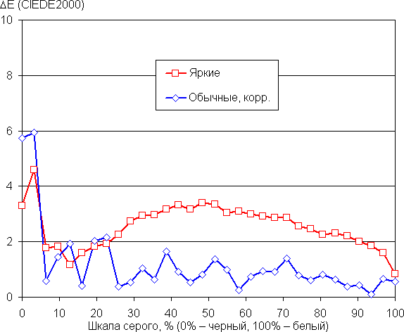 На графиках ниже кривые Яркие соответствуют результатам без какой-либо коррекции цветового баланса (профиль Яркие), а кривые Обычные, корр. — данным, полученным после выбора профиля Обычные и ручной коррекции цветового баланса (точка на круге коррекции — как на снимке выше). (Самые темные области шкалы серого можно не учитывать, так как там баланс цветов не имеет большого значения, да и погрешность измерений цветовых характеристик на низкой яркости большая.)