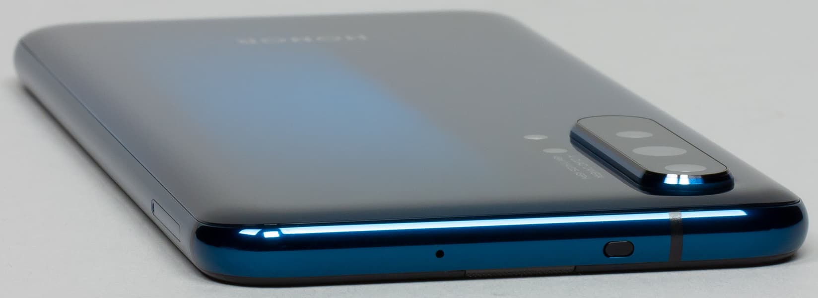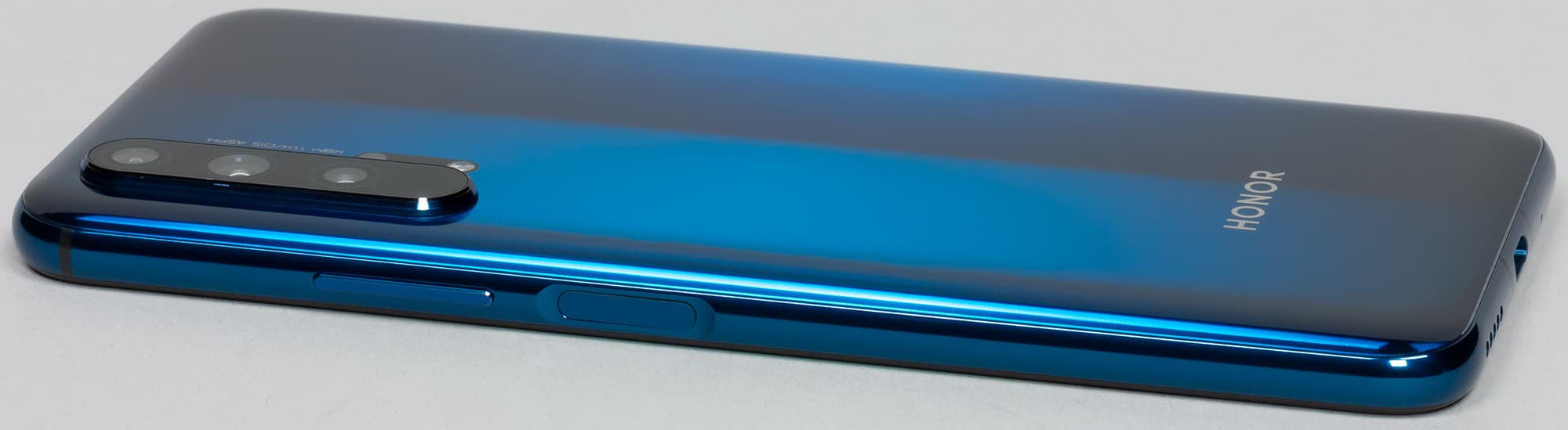 Для Honor 20 Pro предусмотрели лишь два варианта окраса: черный и синий (Phantom Blue, Phantom Black). На фирменных картинках все слегка преувеличено, но «черный» действительно отливает сиреневым, а «синий» отдает зеленым. Полноценной защиты от воды и пыли смартфон не получил.