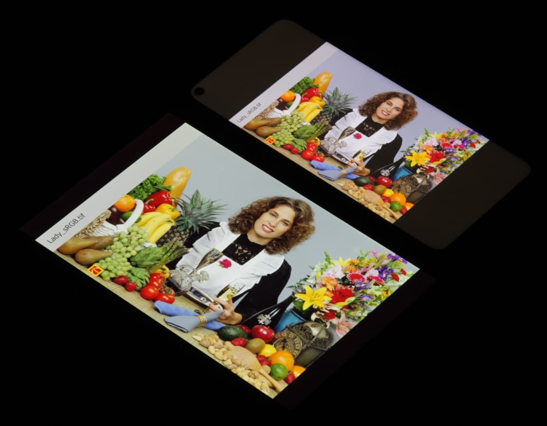 Экран имеет хорошие углы обзора без значительного сдвига цветов даже при больших отклонениях взгляда от перпендикуляра к экрану и без инвертирования оттенков. Для сравнения приведем фотографии, на которых на экраны Honor 20 Pro и Nexus 7 выведены одинаковые изображения, при этом яркость экранов изначально установлена примерно на 200 кд/м², а цветовой баланс на фотоаппарате принудительно переключен на 6500 К.