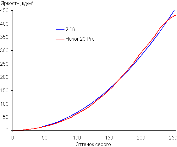 Контрастность (примерно в центре экрана) высокая — порядка 1100:1. Время отклика при переходе черный-белый-черный равно 20 мс (10 мс вкл. + 10 мс выкл.). Переход между полутонами серого 25% и 75% (по численному значению цвета) и обратно в сумме занимает 33 мс. Построенная по 32 точкам с равным интервалом по численному значению оттенка серого гамма-кривая не выявила завала ни в светах, ни в тенях. Показатель аппроксимирующей степенной функции равен 2,06, что ниже стандартного значения 2,2. При этом реальная гамма-кривая заметно отклоняется от степенной зависимости: