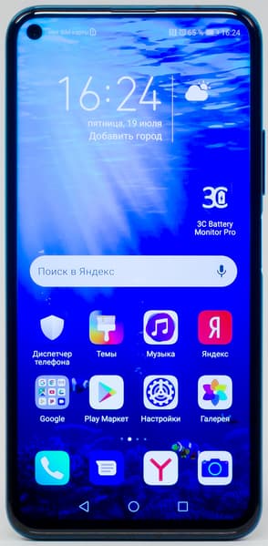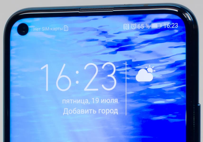 Весьма импонирует также, что здесь не стали делать выдвижных модулей с камерами, тратящих энергию батареи на работу дополнительного мотора. В Honor 20 Pro фронтальная камера проглядывает сквозь отверстие диаметром 4,5 мм, вырезанное прямо в матрице дисплея. Пожалуй, это наилучший из придуманных вариантов.