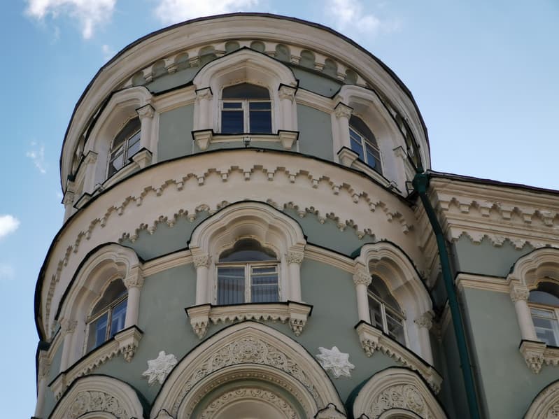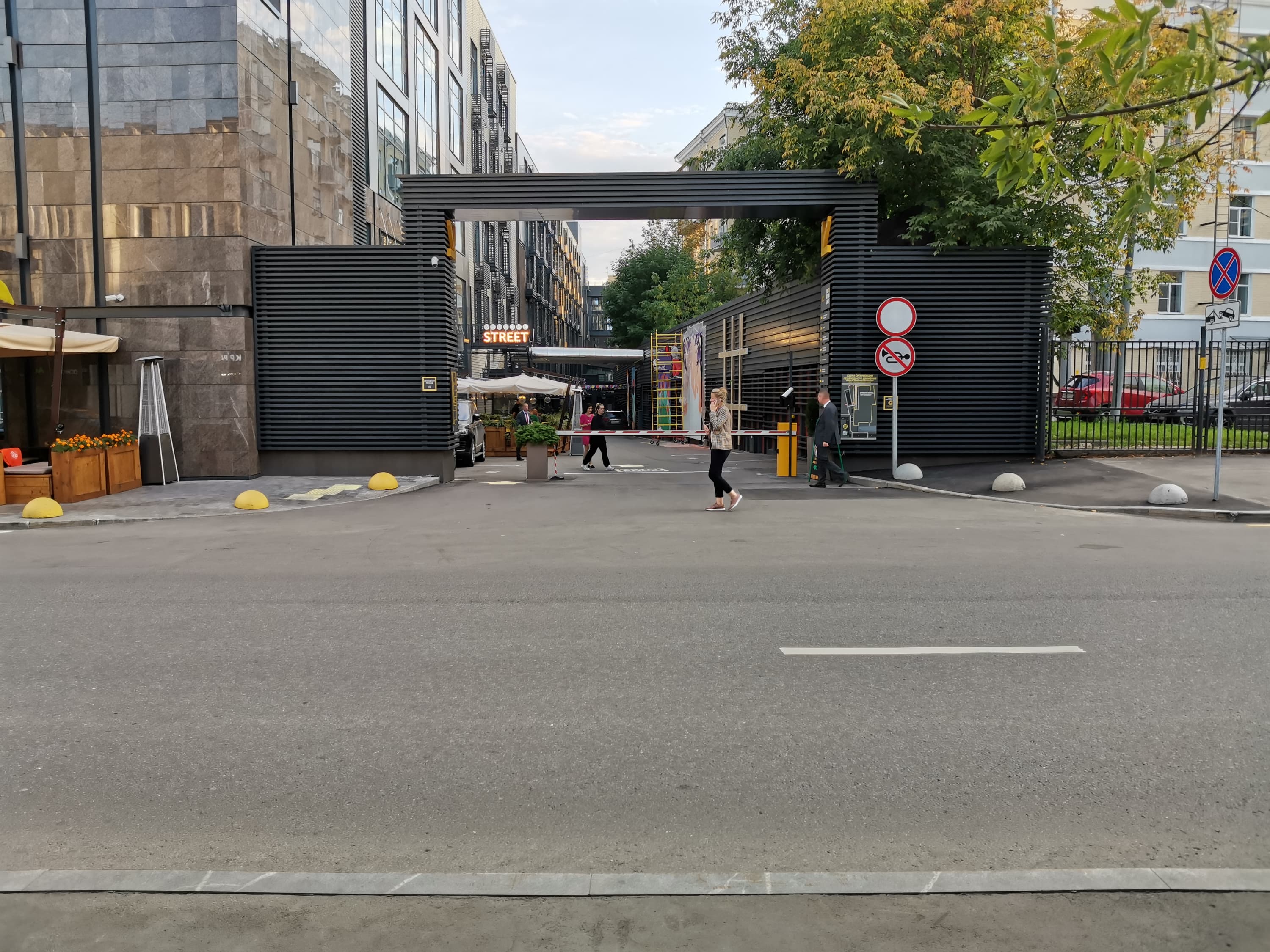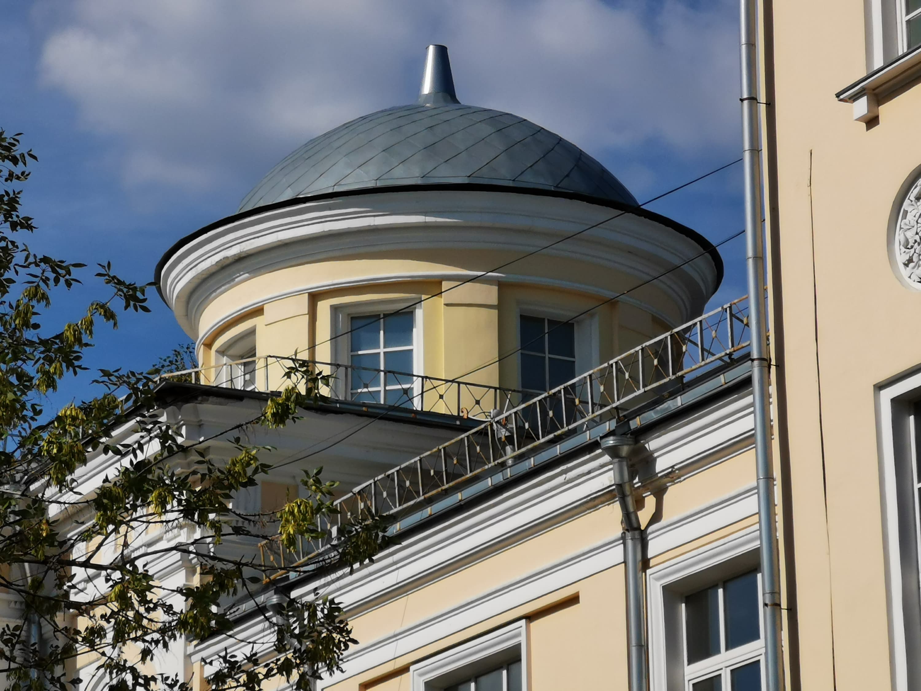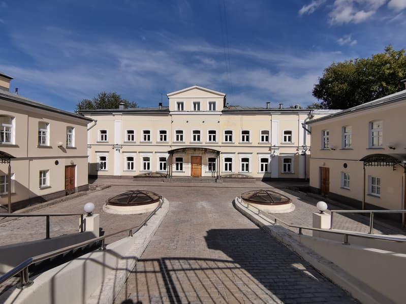 Ещё более полезным такой набор возможностей оказывается в том случае, когда нужно сфотографировать что-то, к чему подойти невозможно. Вот, например, симпатичный домик 1877 года постройки в центре Москвы, безжалостно растерзанный изнутри офисными помещениями. Просто так подойти к нему нельзя – мешает высокий забор. Но зато с помощью широкоугольного объектива Honor 20 Pro можно сфотографировать его целиком с захватом соседних корпусов. С помощью обычной камеры берём в фокус уже только основное здание. А с помощью трёхкратного и пятикратного зума можно показать детали фасада или отдельно фрагмент крыльца.