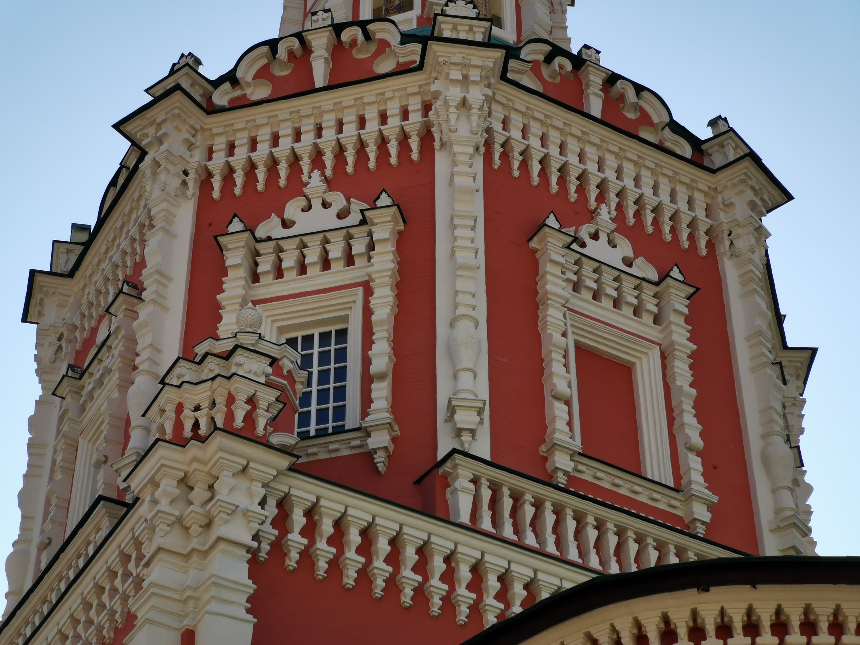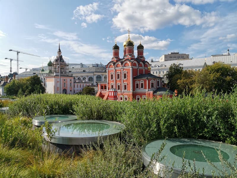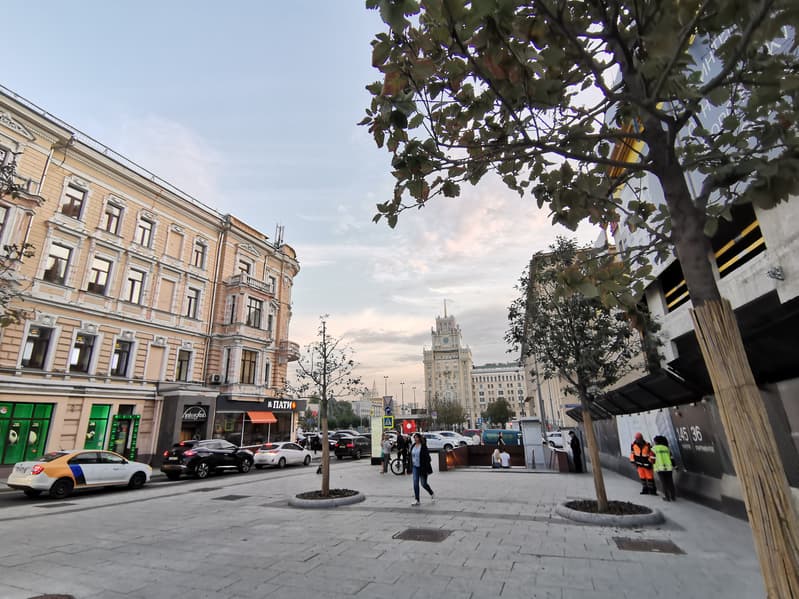 Главная суперсила, которую Honor 20 Pro даёт своему владельцу, – это возможность снимать совершенно разноплановые кадры не сходя с места. В самом прямом смысле этих слов. Например, вот у нас красивая церковь в интересном антураже: позитивный передний план с зелёными кустами и травкой, большой строящийся город вокруг и интересная красная церковь как основной объект съёмки. Если кому-то вдруг интересно, то это Знаменский собор в Москве.