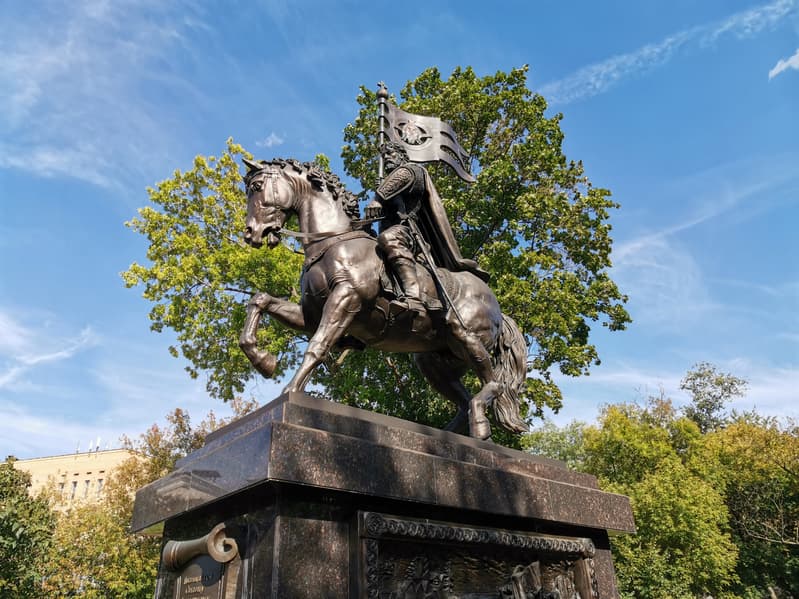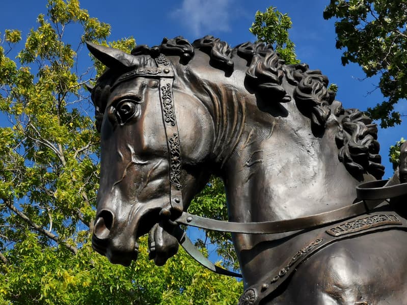 Ещё пример. Этот серьёзный дядя на коне – Дмитрий Донской, отправляющийся на Куликово поле биться с Золотой Ордой. Учитывая, что к памятнику можно подойти максимально близко, широкоугольный объектив тут уже не нужен: для того, чтобы показать скульптуру целиком, достаточно возможностей основного фотомодуля. Трёхкратный зум поможет взять в кадр только лошадь и её наездника. А с помощью гибридного пятикратного зума можно рассмотреть морду лошади и лицо князя.