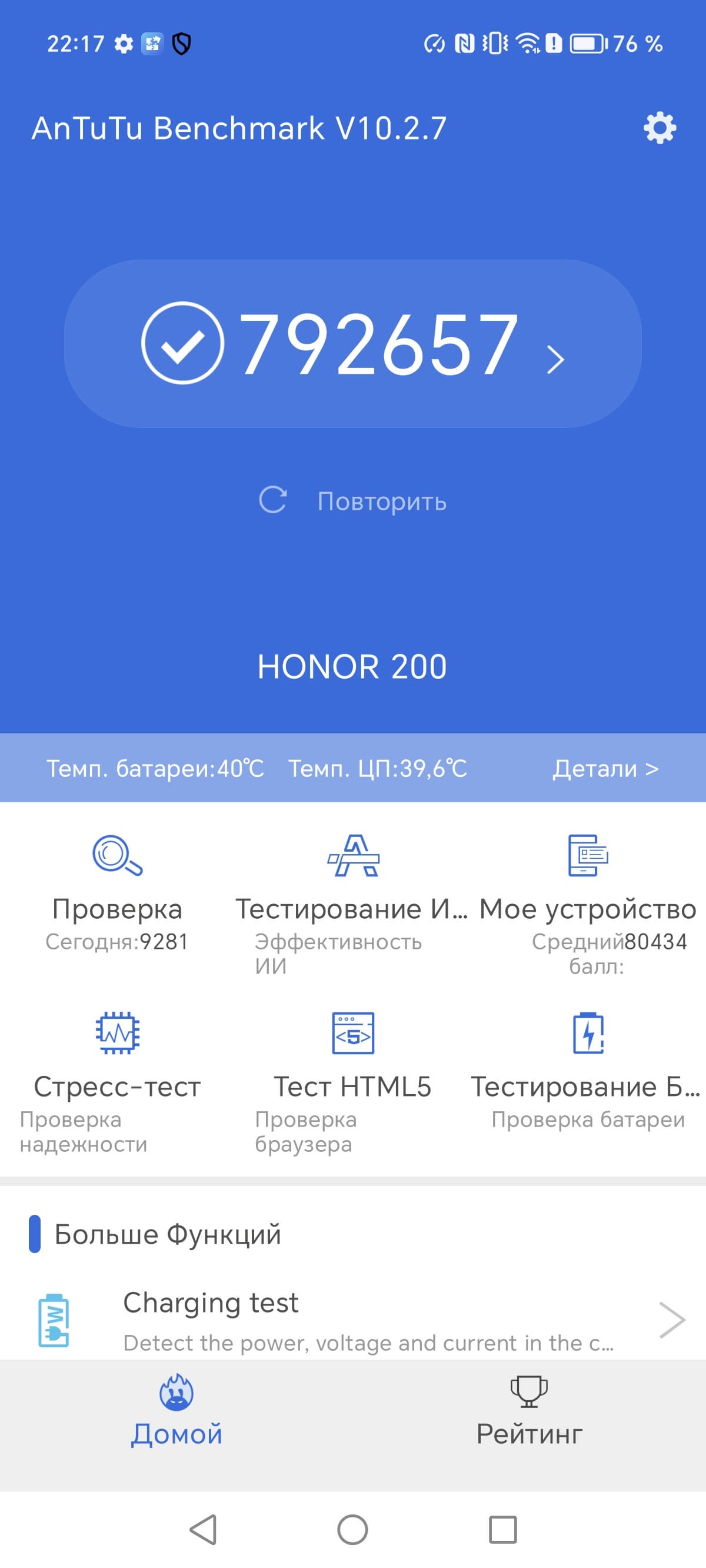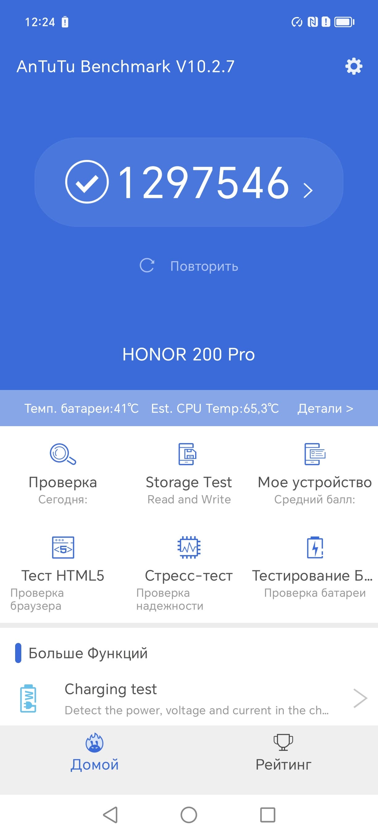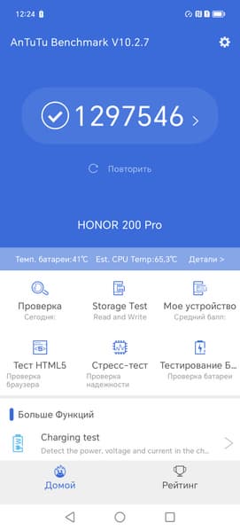 Старший представитель серии, Honor 200 Pro, обеспечен высочайшей производительной мощью. У него самый современный процессор, формально субфлагманский, но наделе мало в чем уступающий топовым чипам. Здесь установлена мощная SoC Qualcomm SM8635 Snapdragon 8s Gen3. У нее 8 процессорных ядер, а роль графического процессора выполняет GPU Adreno 735. Объем оперативной памяти составляет 12 ГБ (LPDDR5X), объем встроенного хранилища — 512 ГБ (UFS 4.0). С ней смартфон выдает почти 1,3 млн баллов в AnTuTu, высокий результат, очень высокий. Такому смартфону по плечу любая трудоемкая задача и любая самая требовательная игра.