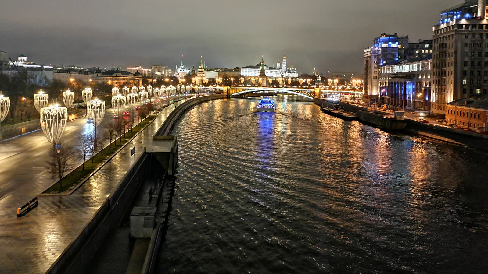 Другой пример — уже с берега. Здесь картина та же: ночной режим смог вытянуть детали на белом подсвеченном Храме Христа Спасителя, очертания прояснились. Можно обратить внимание, что рябь на воде стала более мелкой — таков эффект синтезированной длинной выдержки.