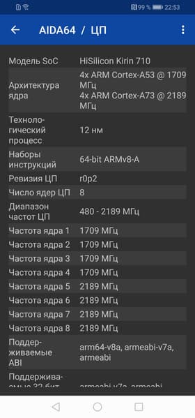 - SoC Kirin 710, 8 ядер: 4×Cortex-A73 @2,2 ГГц + 4×Cortex-A53 @1,7 ГГц