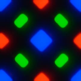 На фрагменте выше можно насчитать 4 зеленых субпикселя, 2 красных (4 половинки) и 2 синих (1 целый и 4 четвертушки), при этом, повторяя эти фрагменты, можно выложить весь экран без разрывов и перехлеста. Для таких матриц компания Samsung ввела наименование PenTile RGBG. Разрешение экрана производитель считает по зеленым субпикселям, по двум другим оно будет в два раза ниже. Разумеется, присутствуют некоторая неровность контрастных границ и другие артефакты. Впрочем, из-за высокого разрешения они лишь минимально сказываются на качестве изображения.